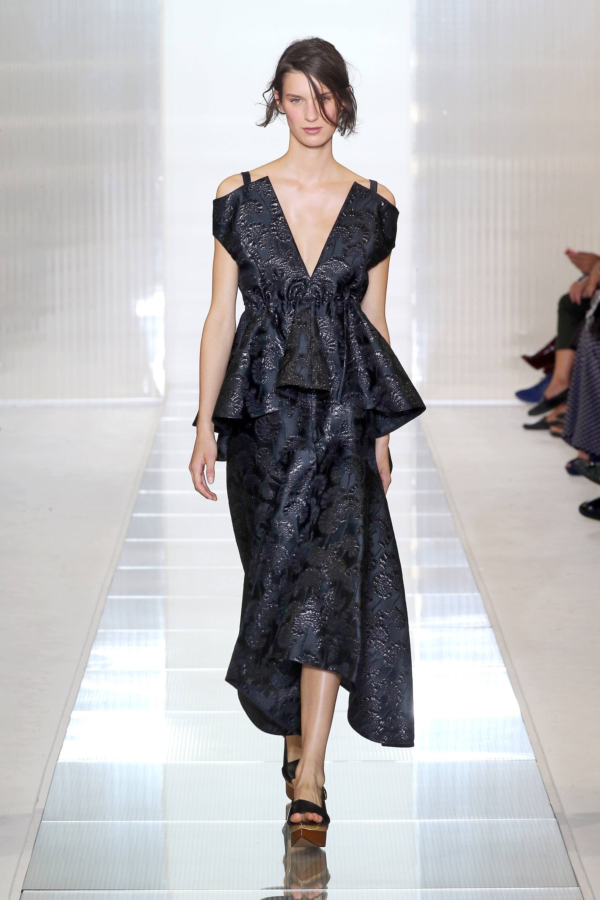 Silhouettes are clean and sculpted: A-line, trapeze and to the knee. The line is effortless yet compact while light and air play with shapes and surfaces. A sense of spontaneity is focal to the collection: dresses look like they’ve had a serendipitous encounter; the fabric seems to be folded nonchalantly, rather than cut, into the final shape. Pleats and peplums are also found and create sensuous additions on tops and skirts. There is an overall tension between delicacy and strictness which adds nuance: short-sleeved shirts and matching pants are as efficient as uniforms.