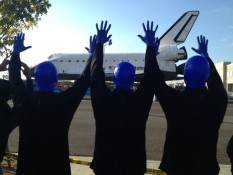 The Blue Man Group was spotted checking out the Space Shuttle Endeavor in Los Angeles as it kicked off its 12-mile journey toward the California Science Center.
