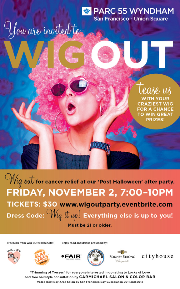 The Wig Out is a charitable “post Halloween” cancer relief party at Parc 55 Hotel on Nov. 2. Proceeds will go to Slap Cancer (Leukemia and Lymphoma) and Locks of Love. Guests are encouraged to sport their craziest wig to the party. In addition to enjoying beats by the notorious DJ Ambrosia Salad, guests will enjoy craft beers from Lagunitas, wines from Rodney Strong, inventive cocktails by Fair Trade Spirits, get a free hairstyle consultation by Carmichael Hair Salon & Color Bar and more.