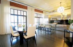 Berchtold Harris’ latest project started with a complete blank canvas in which they transformed into a 2,000-square foot penthouse loft that has been designed with 1920s flair, with dark wood floors, exposed brick, floor length drapes, shag rugs, all on a black and white palette, including an amazing view of the city that reflects off a mounted mirror. The designers have cleverly placed a focal point within the penthouse, which is a breath-taking six-foot milk glass clock that took the manpower of ten men to bring into the penthouse. Luckily, Theron loved every inch of the amazing home from ceiling to floor, making this dramatic design project a complete success.