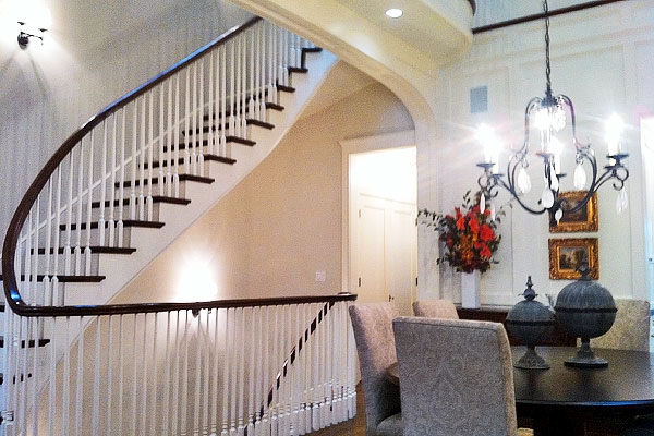 At the very top of the house is a lozenge-shaped skylight that helps the light reach all three main stories of the house and the basement. The skylight is directly above the amazing stairwell that is, without a doubt, the centerpiece of the house. The stairs are unbelievably well done; they wind in the lozenge-shape of the skylight all the way down to the bottom. On the second floor the stairs widen and allows you to overlook the two-story dining room. Yes, I said two-story dining room.