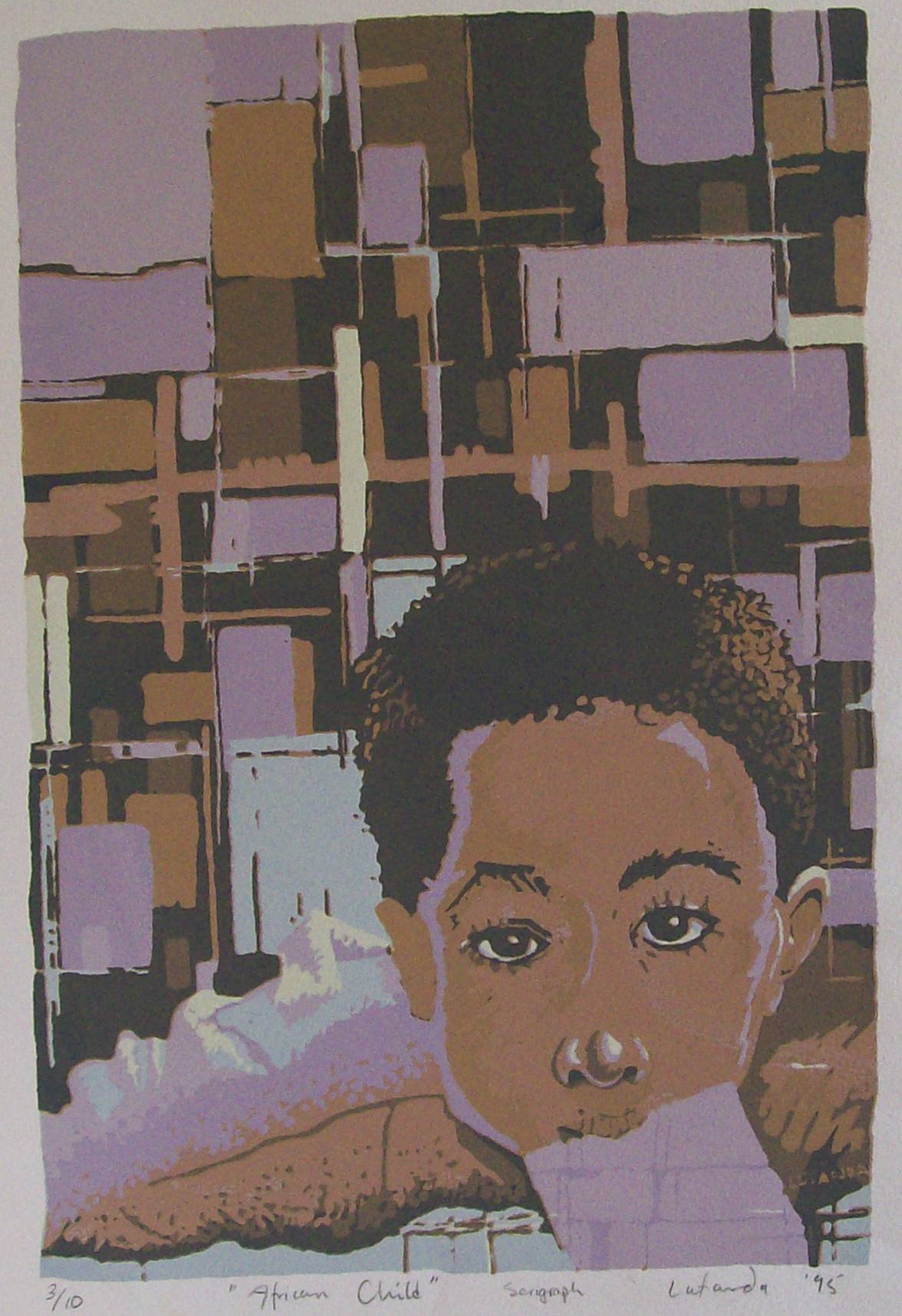 Asked to comment on his work, Lutanda would respond that art is a ‘revelation of the self,’ and his piece African Child is particularly moving in what it reveals about the artist himself. Lutanda depicts a child’s face, bodyless beneath an abstract set of rectangular frames. If the search for a new modern identity is the pursuit contemporary African Artists, ‘African Child’ emblematizes and personifies this desire. Indeed the child himself appears symbolic of the artist, peering out in an attempt to define and navigate an identity amidst changing structures both locally and in a global context. It is the artist who is thrusts himself onto the stage of the contemporary art world through the eyes of this child, firmly establishing his place and perspective. In doing so he creates a modern identity, announcing both his struggle and arrival. While his work communicates a consciousness of its past, Lutanda’s work is deeply aware of its present predicament. In African child we see not only a very modern image aesthetically, but a statement by the artist. By placing himself at the forefront of the modern structures depicted, as the child, he establishes himself as an active player in the creation of meaning. Rather than a passive recipient of a myriad of influences, Lutanda presents the artists as an empowered participant in the dialogue of what modernity is and will be for Africa.