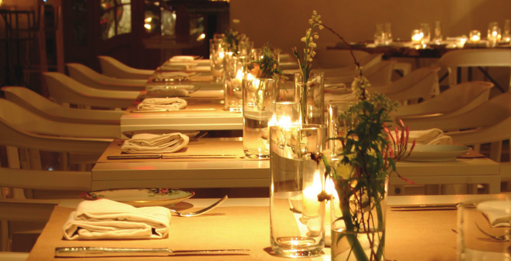 Formal dining room decorated in subdued earth tones, with a contemporary flair from marble-topped communal tables.