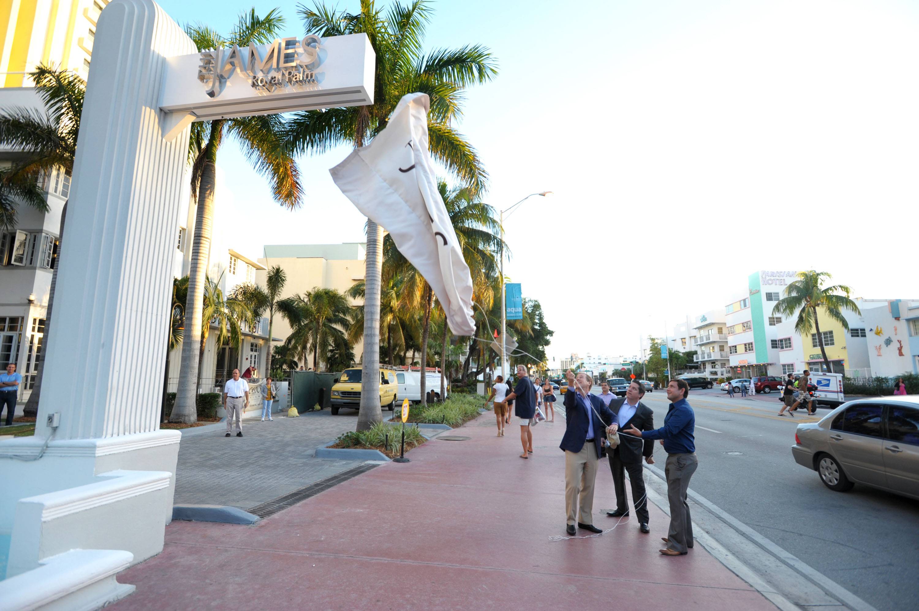 With popular locations in cities such as Chicago and New York, The James Royal Palm has finally made its mark onto Miami territory. As the most anticipated hotel to open in Miami Beach this year, the hotel made its official debut last week. The debut was marked by the unveiling of the new street-side sign on Collins Avenue, signifying the arrival, while reimaging the landmarked Art Deco hotel. The ceremony took place on The Lawn, the front-facing outdoor social space, unique to The James Royal Palm, and was followed by champagne and cocktail fete with food and drinks by Florida Cookery. Guests such as Vice Mayor Michael Gongora and other respected individuals such as Lisa Zandee, Senior President of Brand Management for Denihan Hospitality and original founder of The James brand; all were invited into the newly renovated space that reflected the historic property’s glorious past as a South Beach.