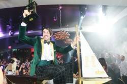 Later in the night to commemorate his impressive milestone, The Gazillionaire was awarded a large gold trophy that he waved in the air as he was carried through the packed club in Hyde’s signature brass boat.