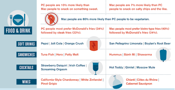 The results also claim that PC users prefer Pepsi, McDonald’s fries and tuna fish sandwiches, while Mac owners opt for San Pellegrino Limonata, bistro-style fries and hummus.