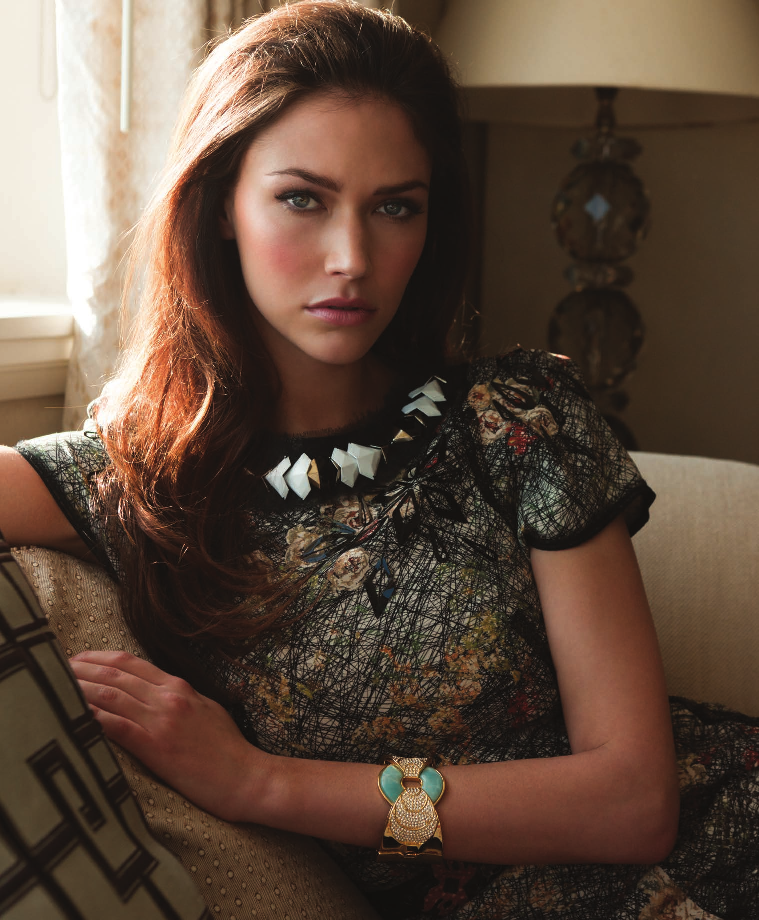 BOTTEGA VENETA silk embroidered necklace on scribble floral print top ($3,500) and skirt ($2,100) available at Bottega Veneta, 457 North Rodeo Drive, Beverly Hills, CA; (212) 371-5511 and 124 Geary Street, San Francisco, CA; (415) 981-1700.