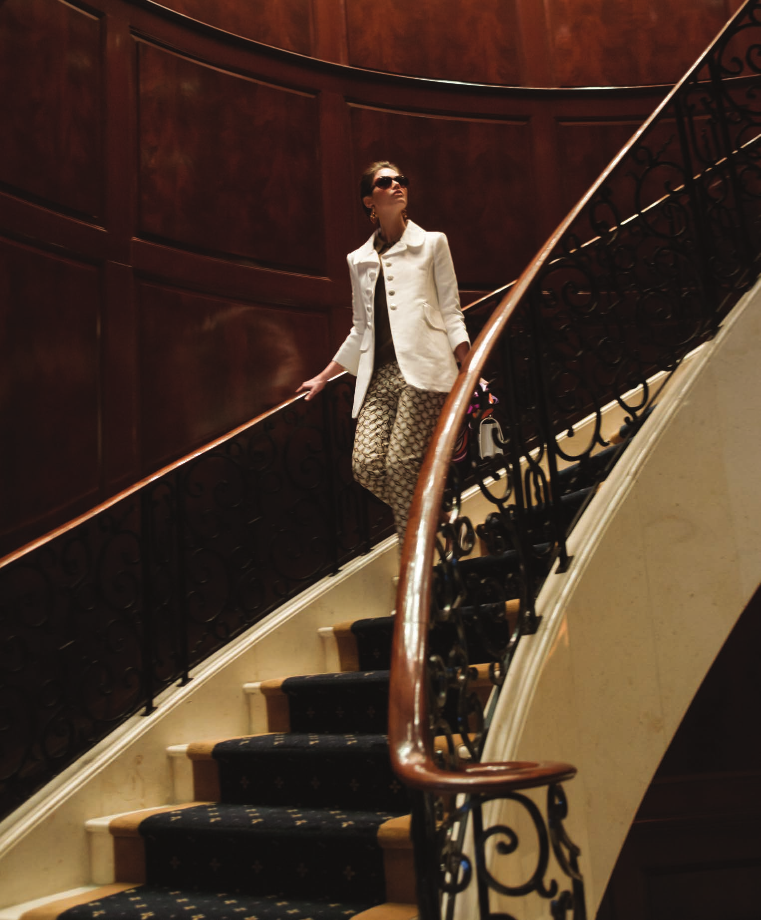LOUIS VUITTON cotton peacoat ($2,940), knit top (price upon request), and printed leather pants ($4,850) available at Louis Vuitton, 295 North Rodeo Drive, Beverly Hills, CA; (310) 859-0437 and 233 Geary Street, San Francisco, CA; (415) 391-6200