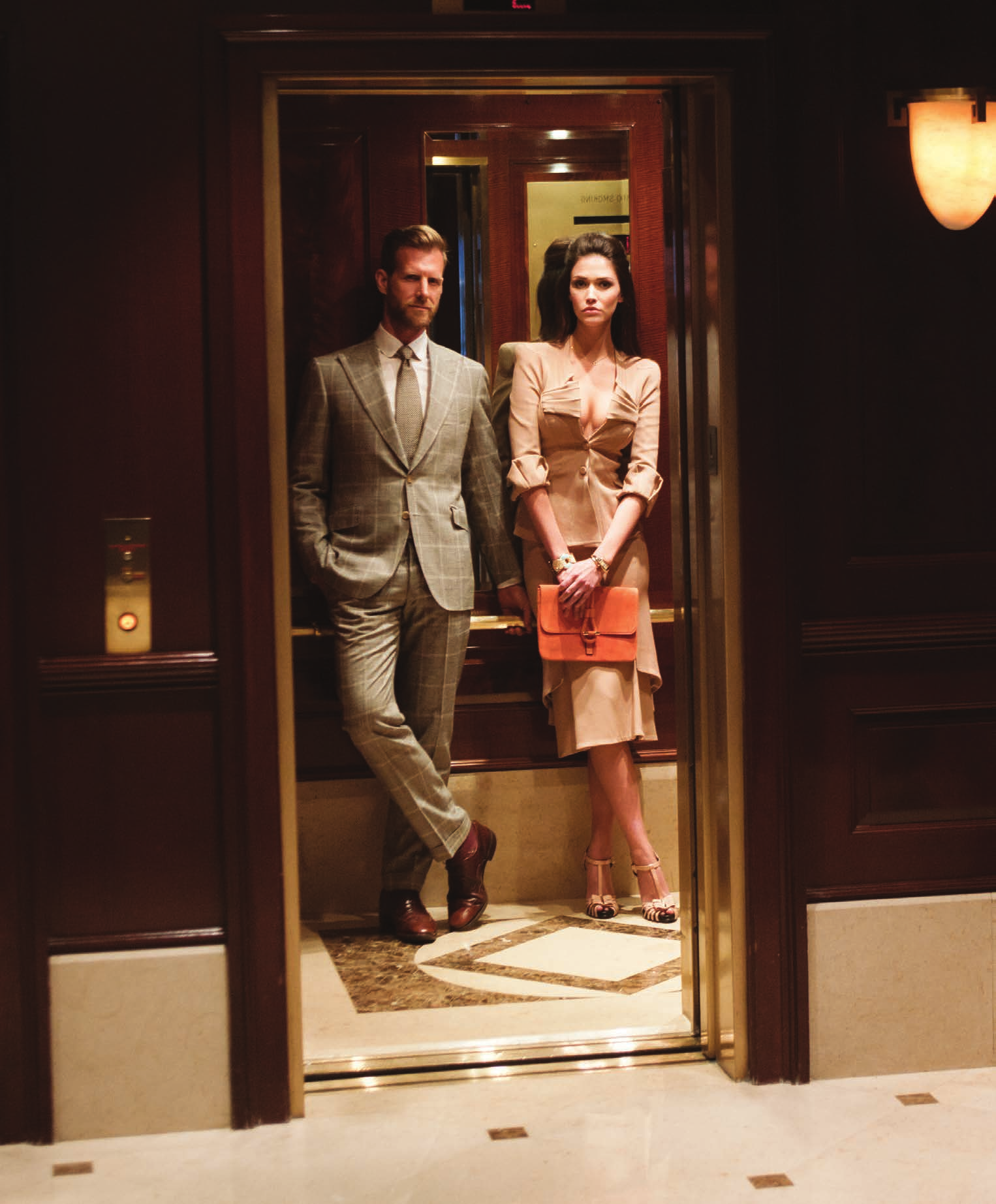CESARE ATTOLINI wool, silk, and linen windowpane bespoke suit ($7,300), cotton shirt ($595) and silk tie ($230) available exclusively at Cesare Attolini, 798 Madison Avenue, New York, NY; (646) 707-3006