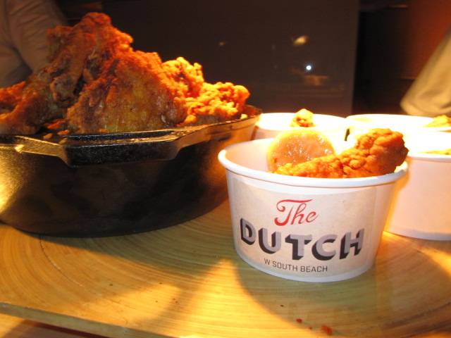 There are the big events, Burger Bash, the Q, with lots of people and endless choices that the Food Network South Beach Wine & Food Festival is famous for. Then there are smaller, dare we say, underrated events? We do. The best of which might just be Chicken Coupe, hosted by Andrew Carmellini, chef and proprietor of The Dutch at the W Hotel South Beach. At this intimate event in the W’s cozy ballroom, the ‘Coupe’ stands for the Riedel champagne coupe they give you to keep and fill endlessly at six champagne stations from French vinters Nicolas Feuillatte, Veuve Clicquot, Pol Roger, Bollinger, Henriot and G.H. Mumm. Then, there was the chicken. Miami was well represented with chicken from Yardbird Southern Table & Bar, Eating House, Amaris Jones from South Street and of course, The Dutch.