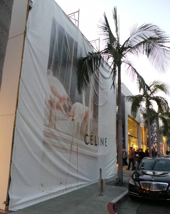 Theboutique411.com recently passed by the new Celine location, which currently features a large white façade with pink flamingos.