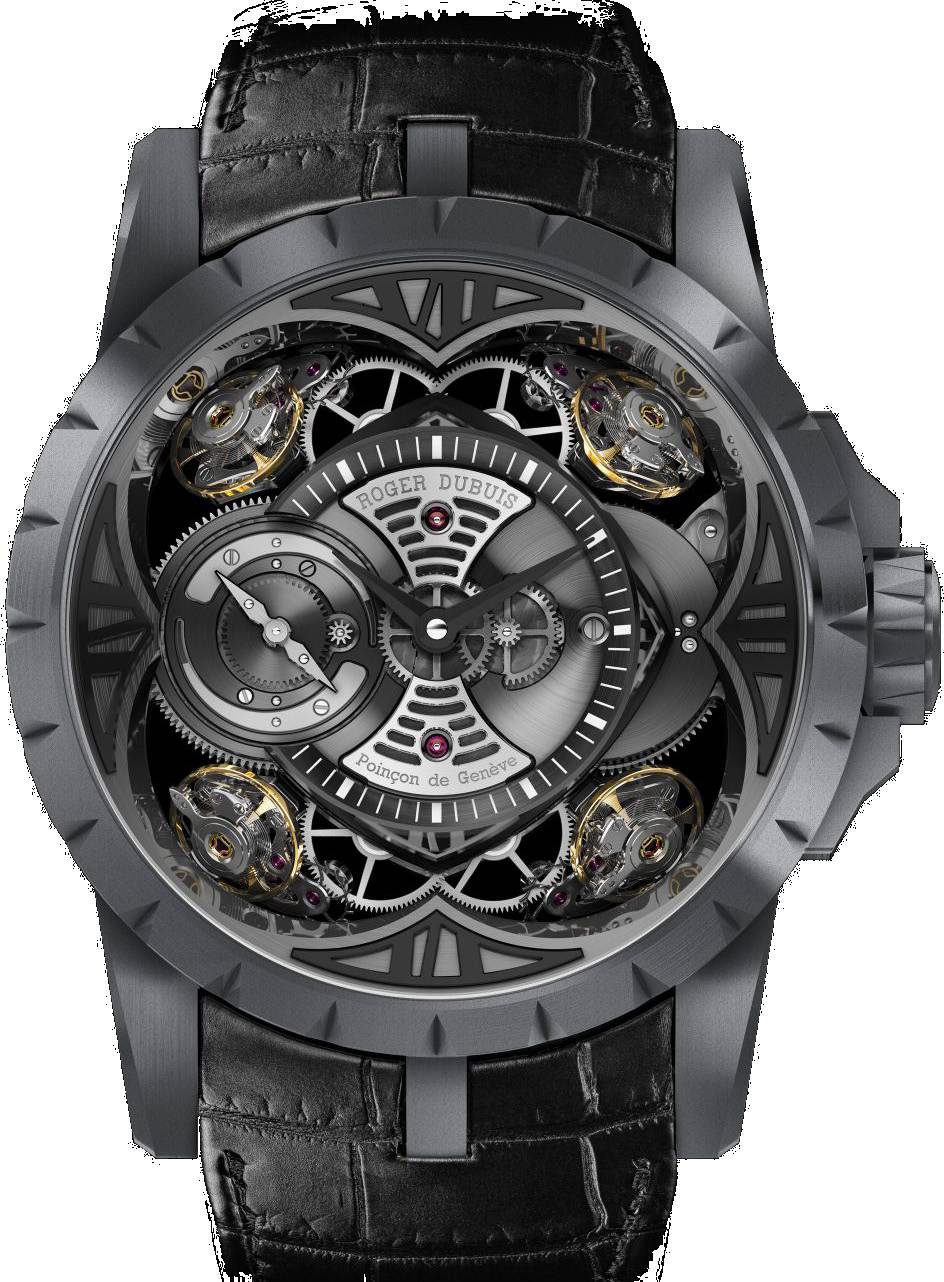 The Roger Dubuis Excalibur Quatuor in Silicon features an RD101 hand-wound mechanical movement which uses a new complication with four separate balances positioned on a 90 degree angle. The Roger Dubuis Quatuor Excalibur uses a type of silicon that is extremely light and durable and weighs half of what titanium weighs and is also four times harder. The case is described as “metallic crystal”, and has a stunning grayish color. The silicon used to create it is similar to the atomic makeup of a diamond. Roger Dubuis will produce 3 pieces of the Excalibur Quatuor in Silicon.