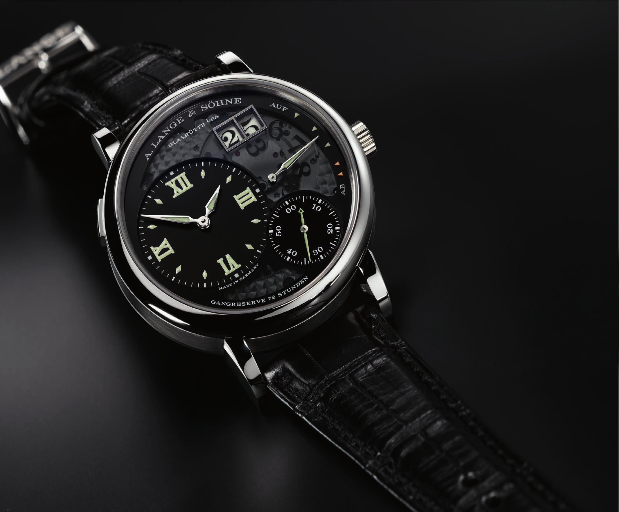 The Grand Lange 1 “Lumen” by A. Lange & Söhne is part of a Limited edition collection of 200 pieces and features a platinum 40.9 mm case which houses a Lange Manufacture Caliber L095.2 movement with a 72-hour power reserve. The black semi-transparent dial of the Grand Lange 1 “Lumen” is a combination of sapphire crystal and blackened silver. The time is indicated in one dial in hours and minutes and subsidiary seconds on another sub dial, along with a power reserve indicator and an outsize date. The A. Lange & Söhne Grand Lange 1 “Lumen” is shown on a black leather strap.