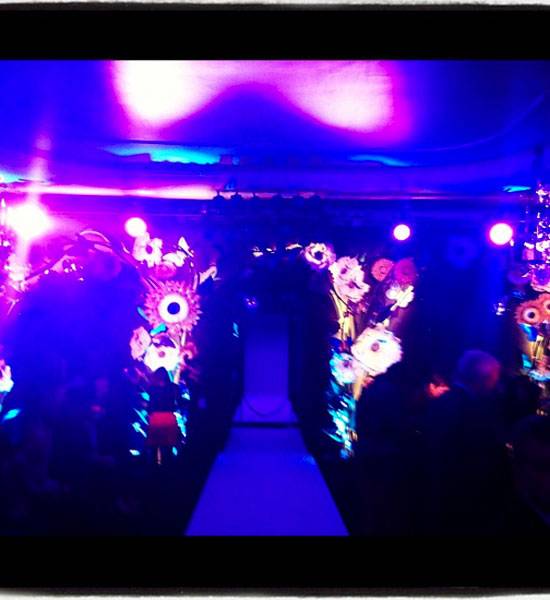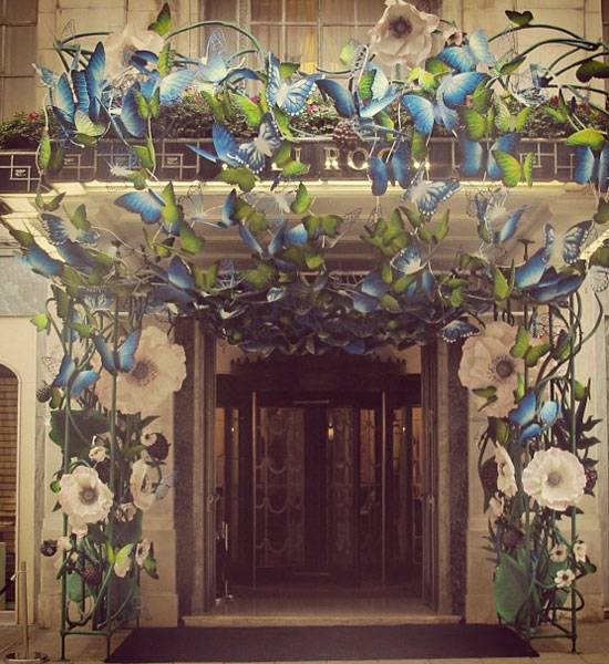 The entrance of Claridge’s was embraced with a swarm of butterflies and tangled wild flowers, along with a carefully crafted floral and foliage structure framing the catwalk made of butterflies, leaves and Mulberry fruits, along with a mixture of woodland flowers such as sunflowers, chrysanthemums, bluebells and poppies.