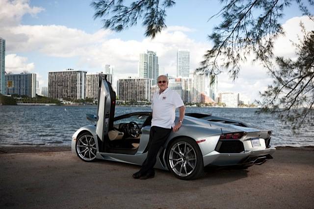 Finishing our multiple turns at the speedway experience, we had a quick lunch and then we were paired off, two writers to a car, to experience one of the great thrills of driving a supercar – touring the streets of town. I was fortunate enough to be paired not only with Don Sherman (long-time Automobile and Car and Driver editor and writer) but with his ace photographer, independent Charlie Magee, who was flown in from London by Lamborghini just for the event. Don, Charlie and I spent many hours that afternoon, exploring some of the most scenic locations around Miami and neighboring areas and obtaining lots of terrific shots of the cars (including those seen here and in the separate article elsewhere in this issue focused more on the car itself). The Aventador showed its good breeding well, never hesitating in traffic, running well within normal temperatures despite long periods of idling while we set up shots. Utilizing both the cylinder deactivation system (just six cylinders runs when there’s a light load) and the start-stop technology (re-starts in 180 milliseconds!) helps greatly reduce the CO2 production while the fuel consumption is about twenty percent less than last year’s Aventador coupe. Can you imagine – discussing MPG with a 700HP car that rushes 0-60 in three seconds!