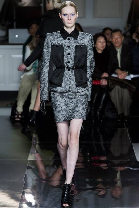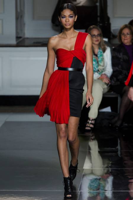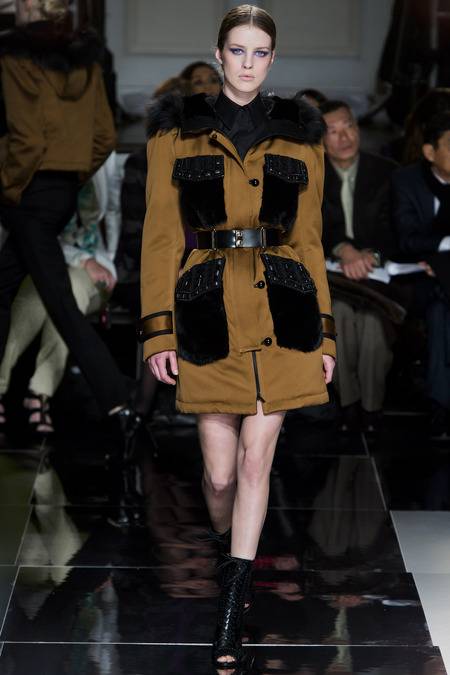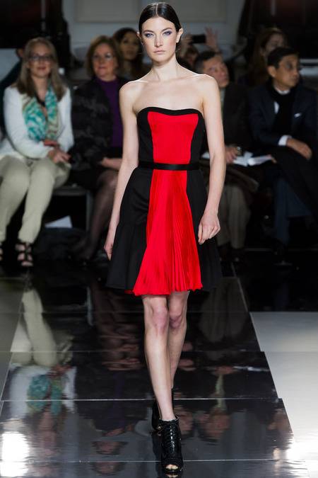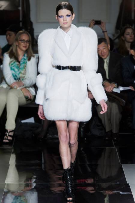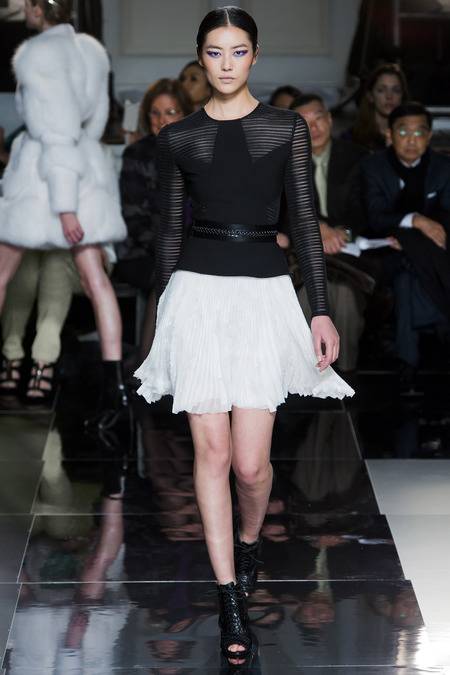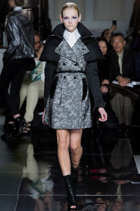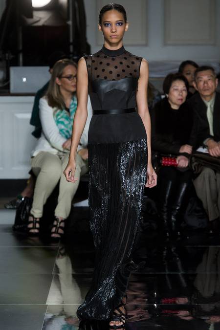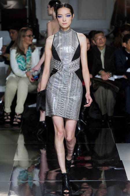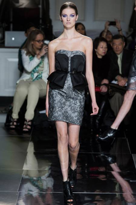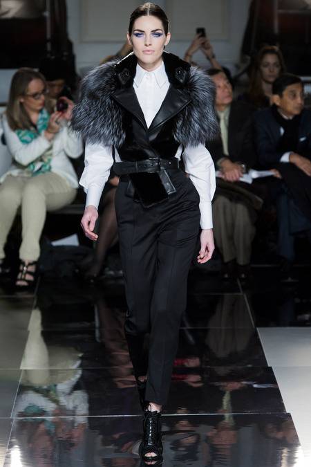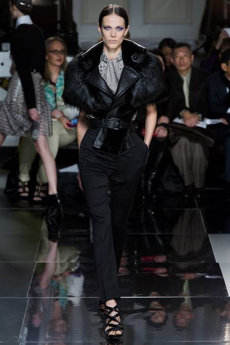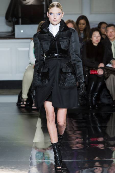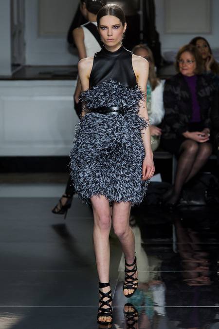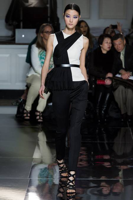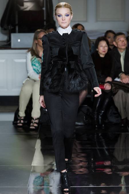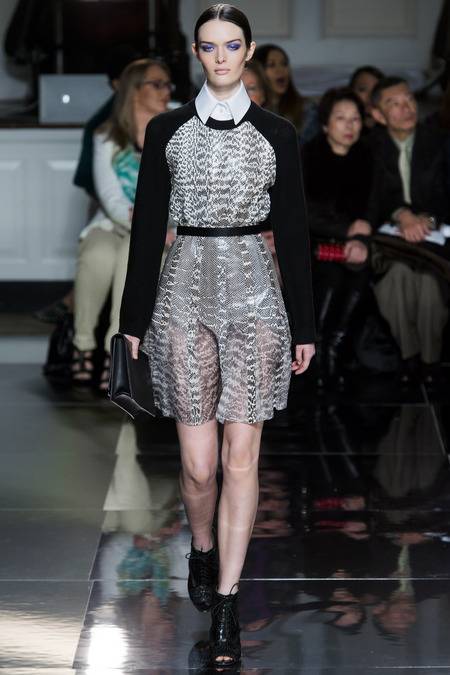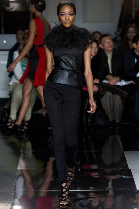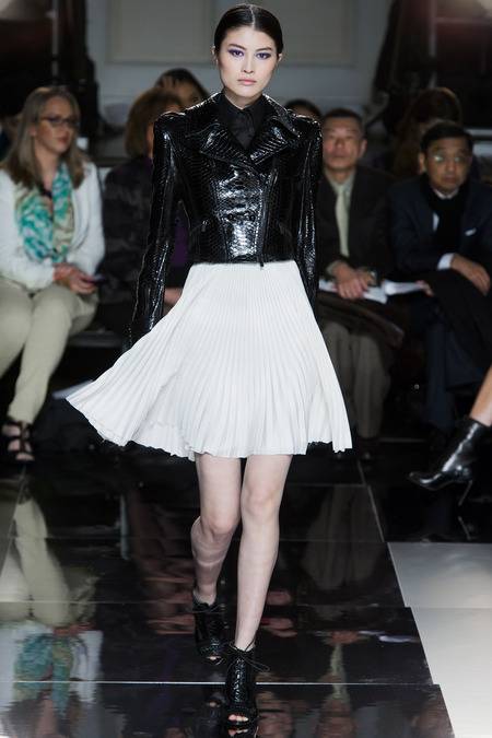 Wu, who recently tapped Stephanie Seymour (one of the original supermodels) as the face of his Spring campaign, sent a decidedly womanly collection down the runway. The girlish prints of his first collections were nowhere to be seen; in their place, a palette of black and white, complemented by the occasional pop of red, blue, and burnt gold. A nipped-in waist (a true waist, not at the hips) powerfully defined feminine curves, further accentuated by luxe materials. Foxfur adorned a satin trench, a belted dressed frothed with ostrich plumes, and a python leather jacket added structure to a flouncy pleated skirt.