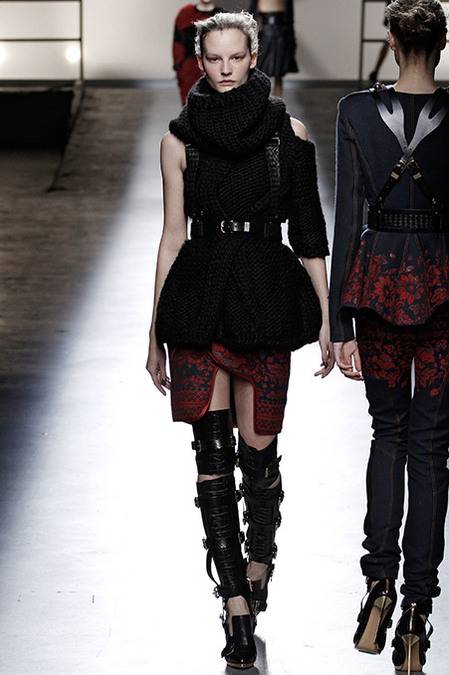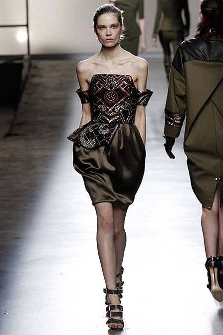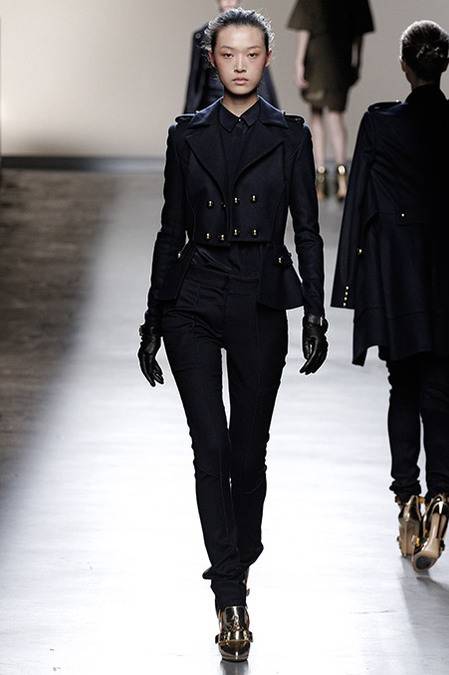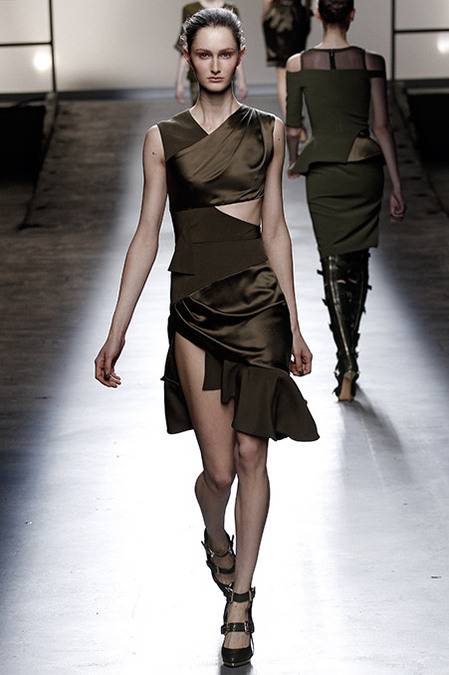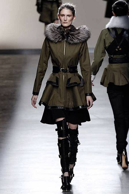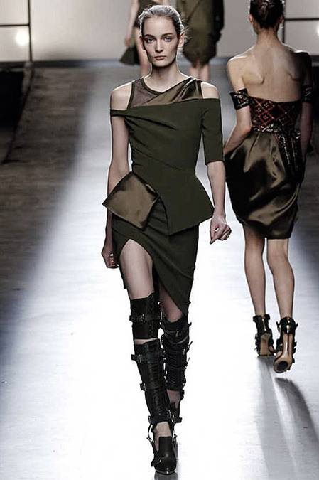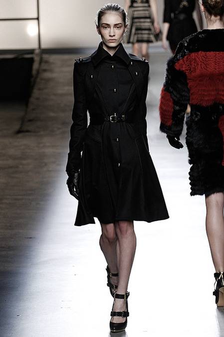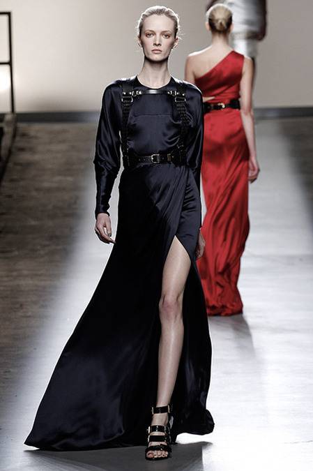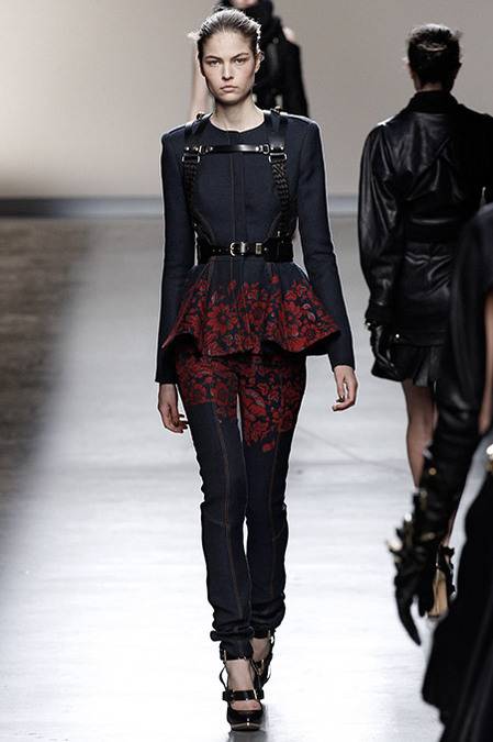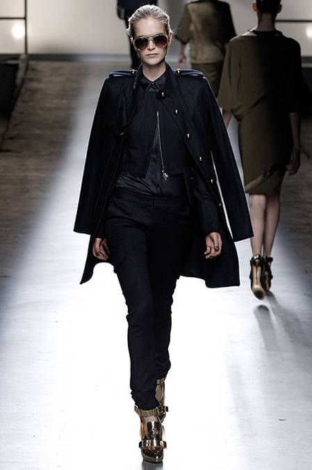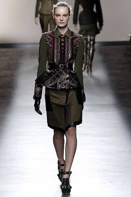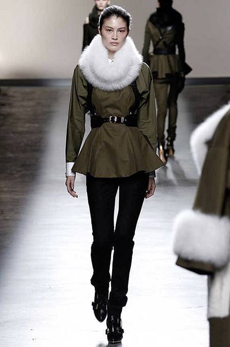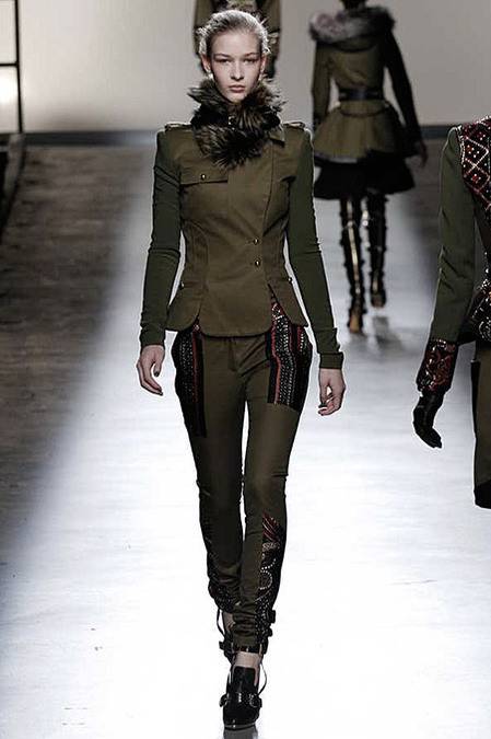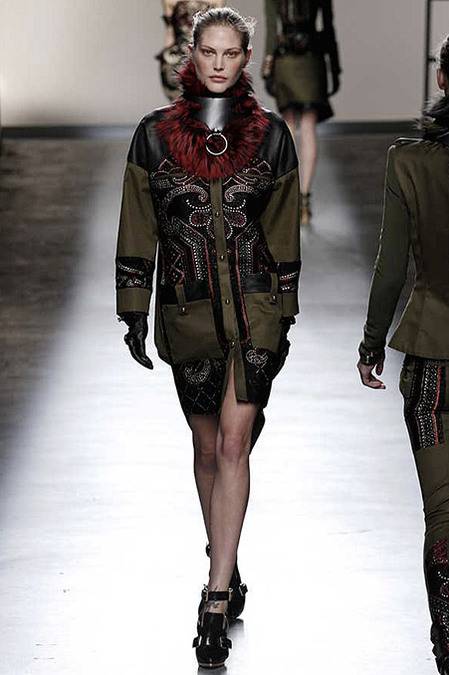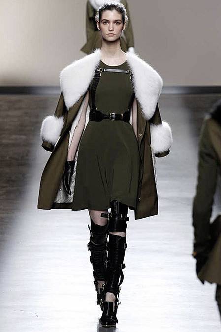 Perfectly tailored trousers complemented structured jackets with nipped waists, peplums in thick wool, fur collars, and leather harnesses. From the more ready-to-wear pieces to the dresses, feminine detailing reigned supreme. Long-sleeve gowns of draped silk were accented by adjustable army-style harnesses, while long, fluid dresses with sharp cut-outs were nothing short of bombshell gorgeous. Intricate brocade needlework, bohemian patterns and splashes of bold red complemented the otherwise military-issue palette of olive, navy, black, and white.