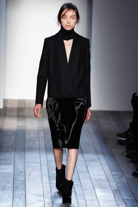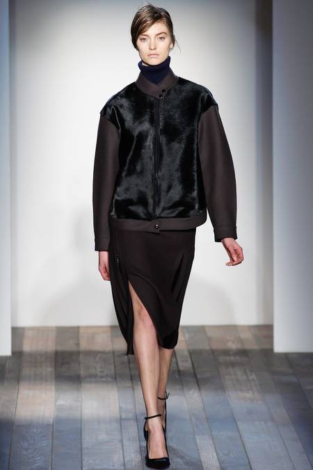The coats stole the show, with a long color-blocked number in camel and lilac, a black tuxedo-style smoking jacket with cape slits at the arms, and a bomber with fur body and brushed wool sleeves. Although the exaggerated shoulders seen at Alexander Wang and Altuzarra made an appearance, the look was less Amazonian, more romantic, with perfectly tailored pencil skirts and form-fitting dresses.