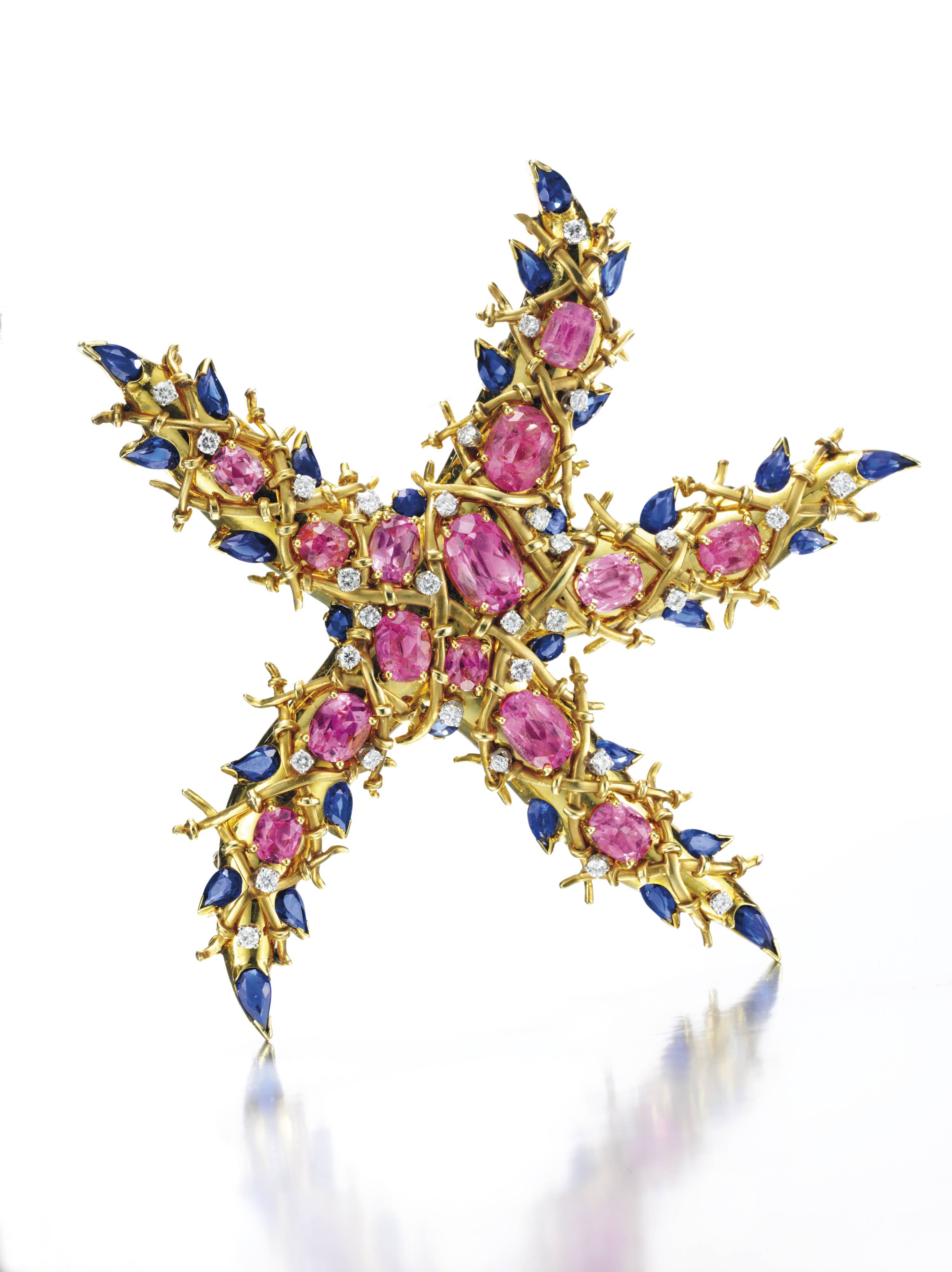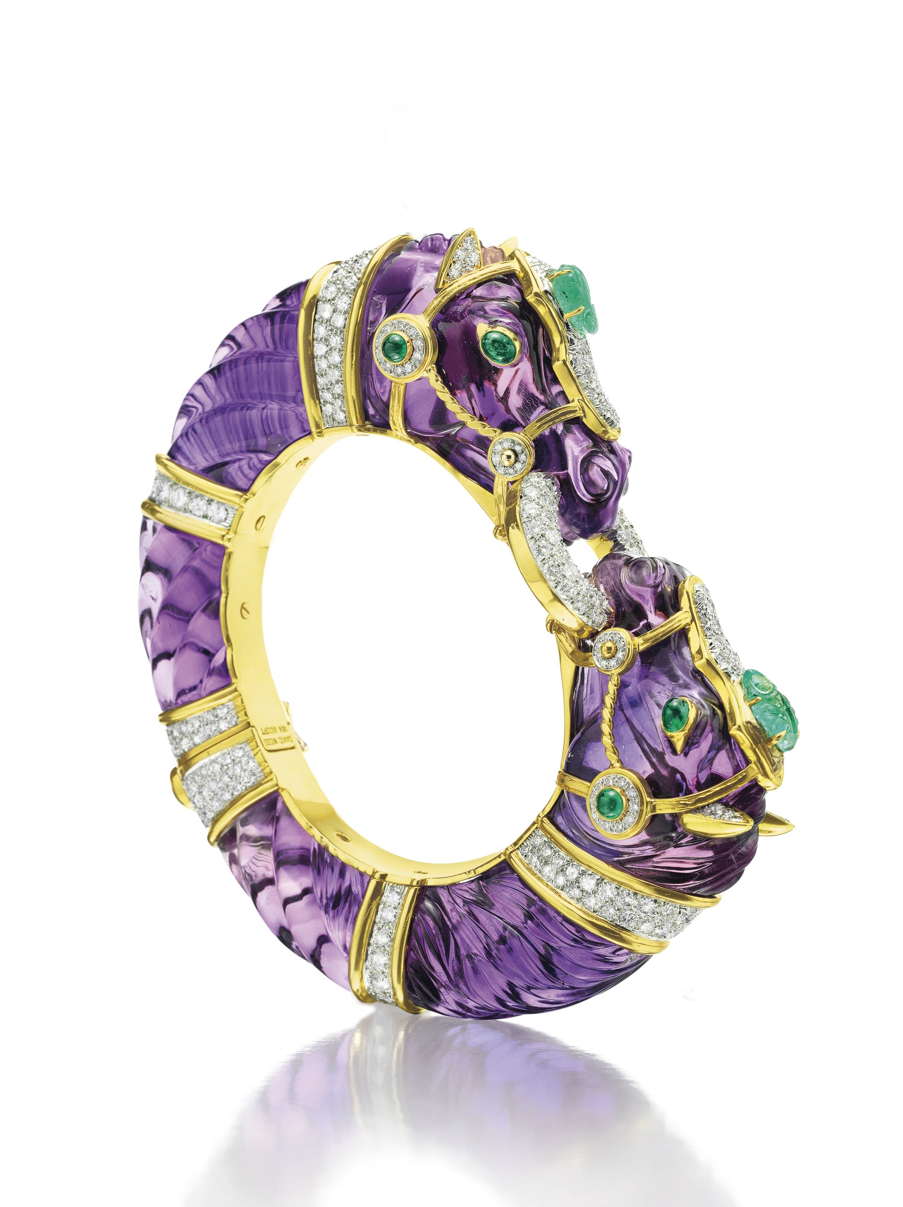 A few of the highlights include a rare diamond and emerald necklace by Winston, estimated at $800,000 -$1,200,000, a Van Cleef & Arpels, D-color pear-shaped diamond ring, a David Webb amethyst, emerald and diamond bangle bracelet and a circa 1945 diamond and multi-gem starfish brooch courtesy of Jean Schulmberger.