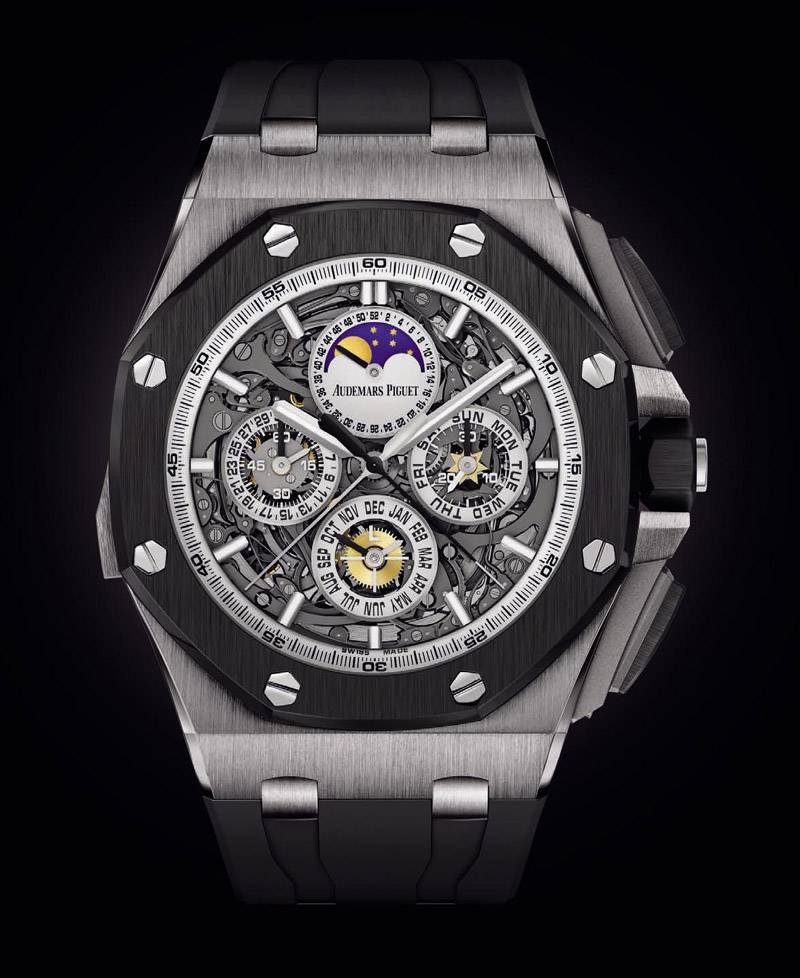 The Grande Complication Royal Oak Offshore is one of the 2013 new releases from Audemars Piguet and features a 44mm titanium case accented with a black ceramic bezel, push pieces and crown. Equipped with a Calibre 2885 self-winding movement, the Grande Complication includes a minute repeater, perpetual calendar, split-second chronograph, hours, minutes and small seconds. The impressive sapphire dial of the Grande Complication Royal Oak Offshore features white counters, white gold applied hour-markers and Royal Oak hands with luminescent coating. Shown on a black rubber strap with titanium pin buckle, the Grande Complication Royal Oak Offshore by Audemars Piguet is part of a 3-piece limited edition.
