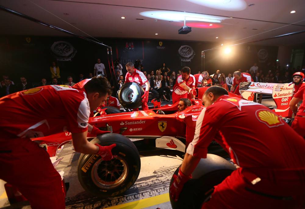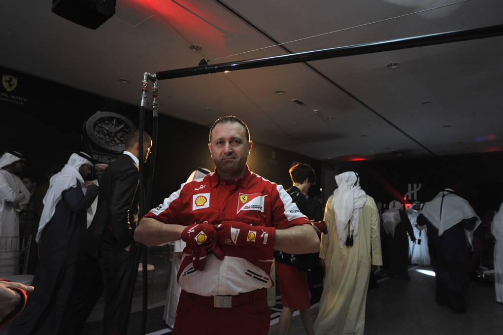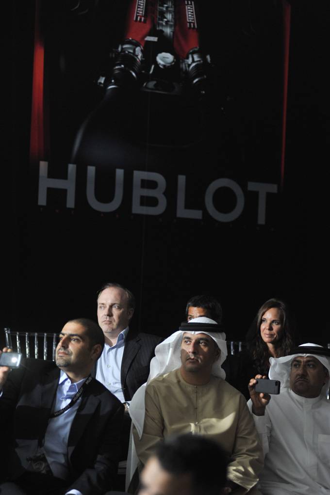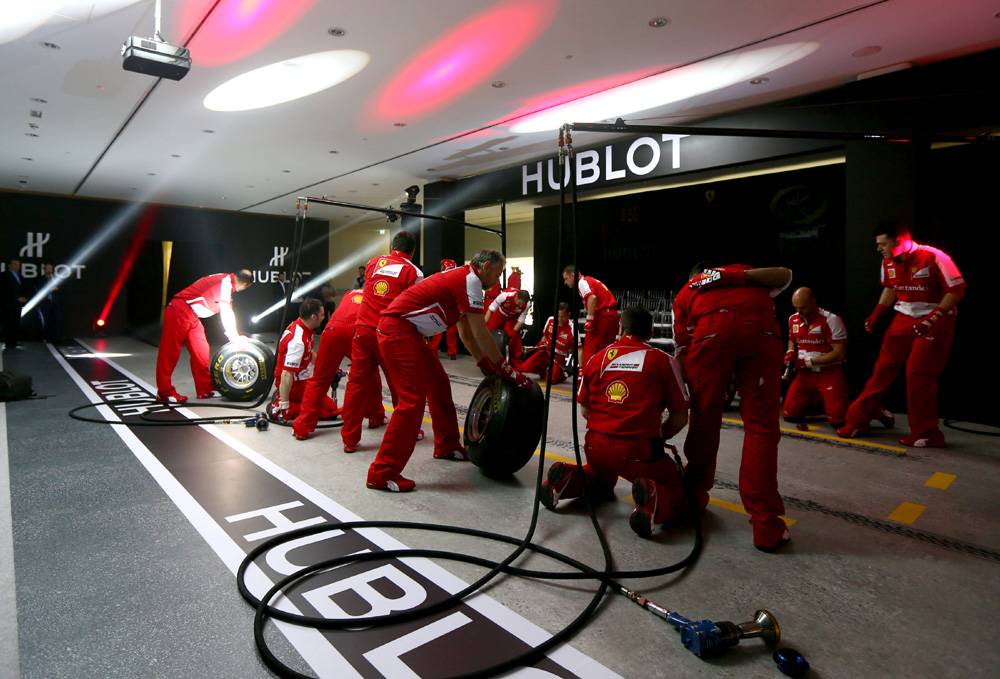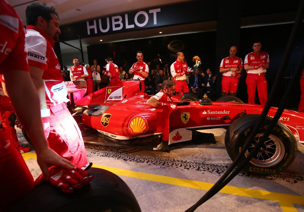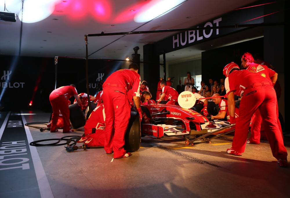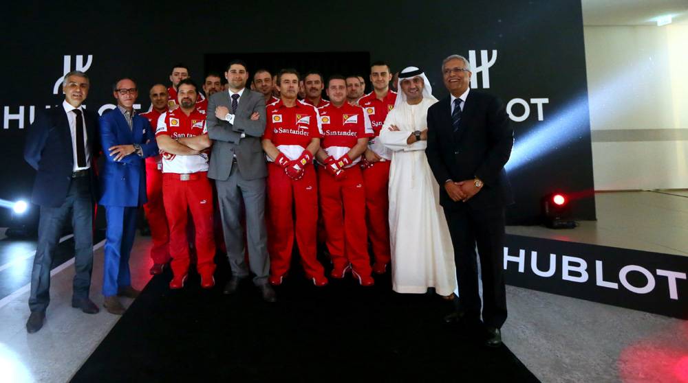 Luxury watchmakers Hublot are helping fellow prestige brand Ferrari celebrate their 25th anniversary in the United Arab Emirates with a limited edition new timepiece. The luxury partners gathered at the Al Tayer Ferrari Showroom in Dubai this week to unveil Hublot Big Bang U.A.E. model. More than eighty journalists and two hundred guests attended the unveiling, where pros from the Scuderia Ferrari team showed off their racing skills for the crowd by beating the clock in a pit stop practice under real-world conditions (a first in Dubai). Guests also had the chance to see the Ferrari-stamped U.A.E. watch, which will be produced in a series of just 25, in reference to the automaker’s 25th anniversary in the Middle East.