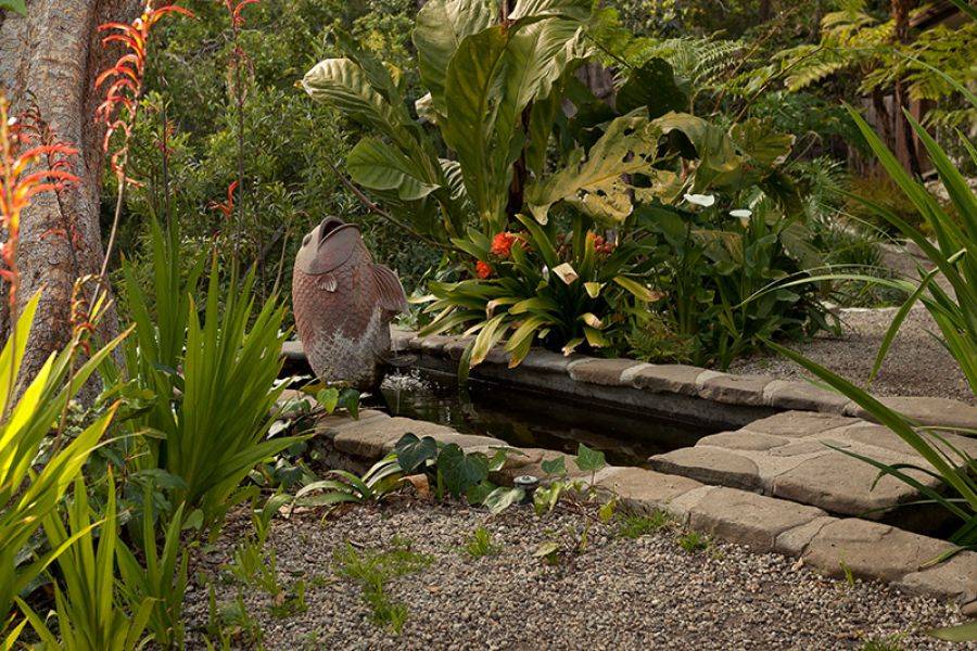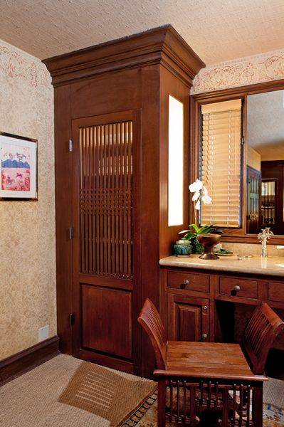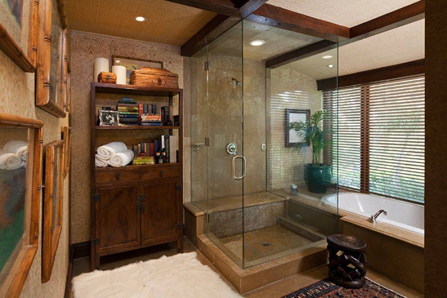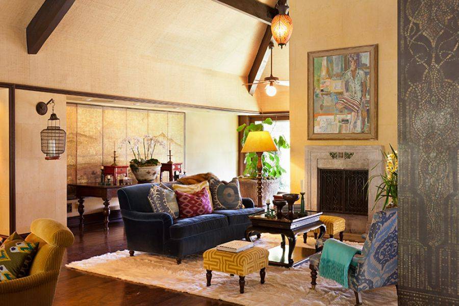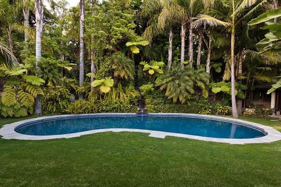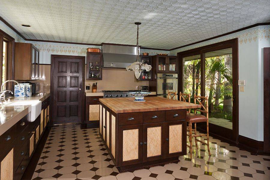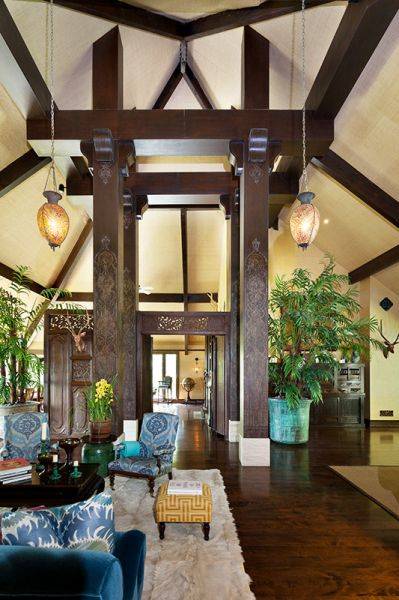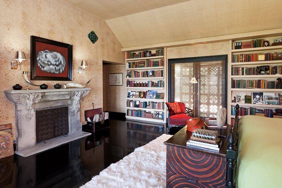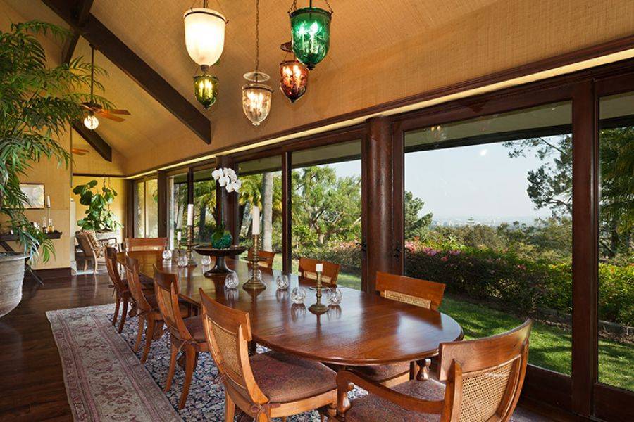 The home features 4,770 square feet of living space and sits on approximately 1.43 acres. Featuring four bedrooms and 4.5 bathrooms, the Bel Air estate was renovated in a Balinese-inspired style by Million Dollar Decorator Martyn Lawrence Bullard. According to Real Estalker, the main living areas have dark wood floors, high vaulted ceilings held up by carved wood columns, wood-framed sliding glass doors, and a “mature tropical landscaping.”