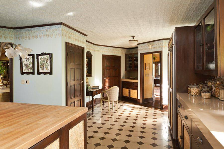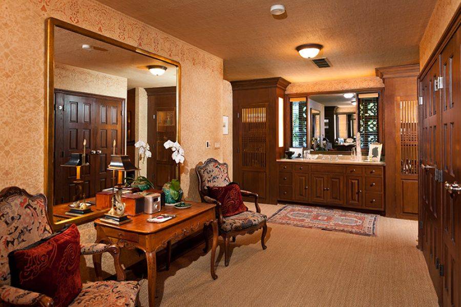The one-story home also has a staff room, guest house, wine cellar, eat-in chef’s kitchen with a large center island and industrial-style appliances, textured ceilings, tiled floors, a long gated driveway that opens into a large motor court, a three car garage, kidney-shaped pool, pathways, palm trees, fountains, and more. The master suite includes a fireplace, sitting area and spa-like bathroom with “rich woodwork” accents.