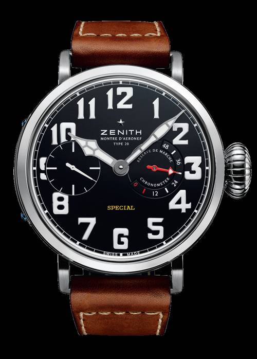 From the Zenith Pilot Collection comes the Montre d’Aéronef Type 20 Titanium. This piece is part of a Limited series of only 250 pieces and features a 57.5 mm polished and satin finished Grade 5 Titanium case and housing a Calibre 5011K hand-wound movement with a 48 hour power reserve and is Chronometer Certified by the COSC. The dial is matte black with superluminova hands and numerals. The dial shows hours and minutes on the central dial, small seconds at the 9 o’clock position and the power reserve indicator at the 3 o’clock position on the dial. The Pilot Montre d’Aéronef Type 20 Titanium features a sapphire crystal and case back, allowing for a fantastic view of the movement. Shown on a brown calf-skin, hand-sewn strap with top stitching and matching titanium pin buckle, The Zenith Montre d’Aéronef Type 20 Titanium retails for $12,800.