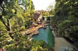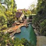 There is also a two-story detached structure with a three-car garage, a music studio, and a caretaker’s apartment. A second guesthouse is located above the swimming pool, at the back of the main house.