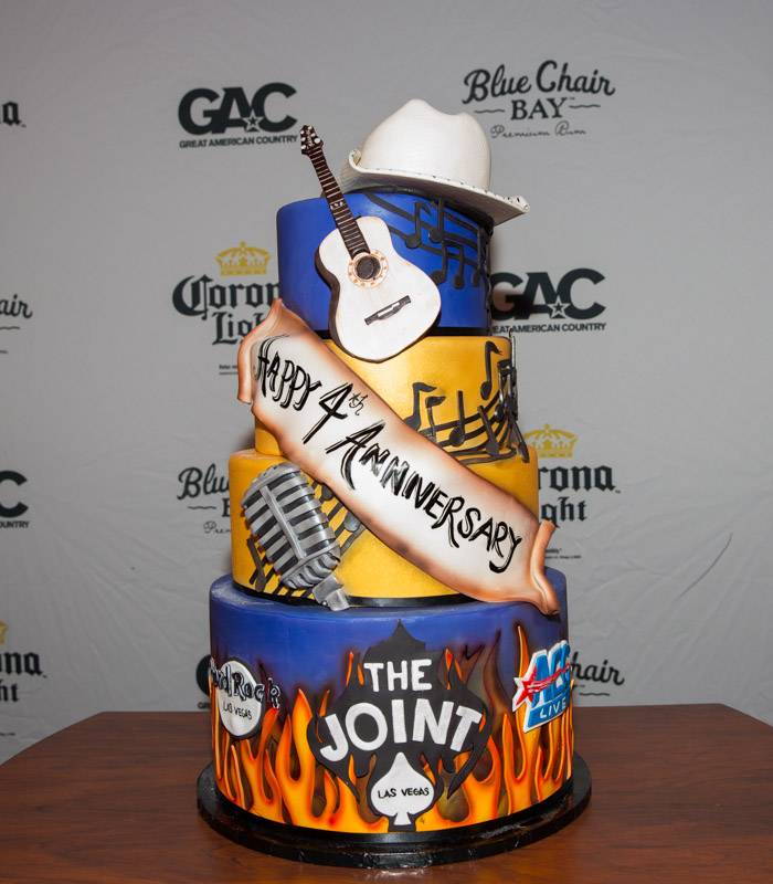 Friday and Saturday marked his sixth and seventh performances, respectively, at the venue. The country rocker took time before his sold out show on Friday to celebrate The Joint’s anniversary with AEG Live Las Vegas’ vice president John Nelson and vice president of booking Bobby Reynolds and Hard Rock Hotel COO Jody Lake, vice president of entertainment Paul Davis, executive director of entertainment operations Chas Smith and box office manager Lori Guzzard. Caked Las Vegas created an over-the-top, four-tiered, music-themed masterpiece in honor of the venue’s anniversary.
