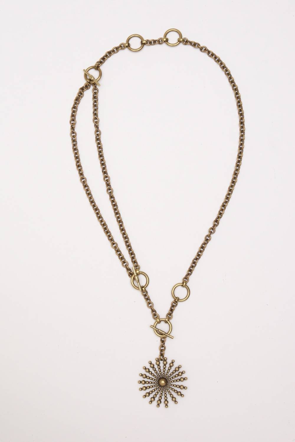 Ramy Sharp: The necklace can be worn short or long. It comes with the Ramy Brook logo, a brass sunburst and a sharks tooth in leather. You can wear both together or separately. The chain can also be worn as a bracelet.
