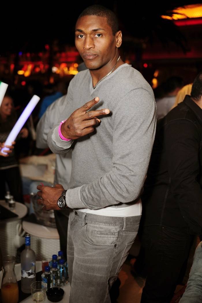 The Los Angeles Lakers forward, formerly known as Ron Artest, was seen again Saturday night at Surrender Nightclub drinking Grey Goose cocktails with friends and moving to the sounds of Above & Beyond. The colorful and sometimes controversial NBA player even jumped up onto the deejay stage to the delight of the cheering capacity crowd.