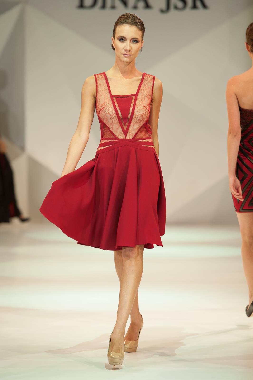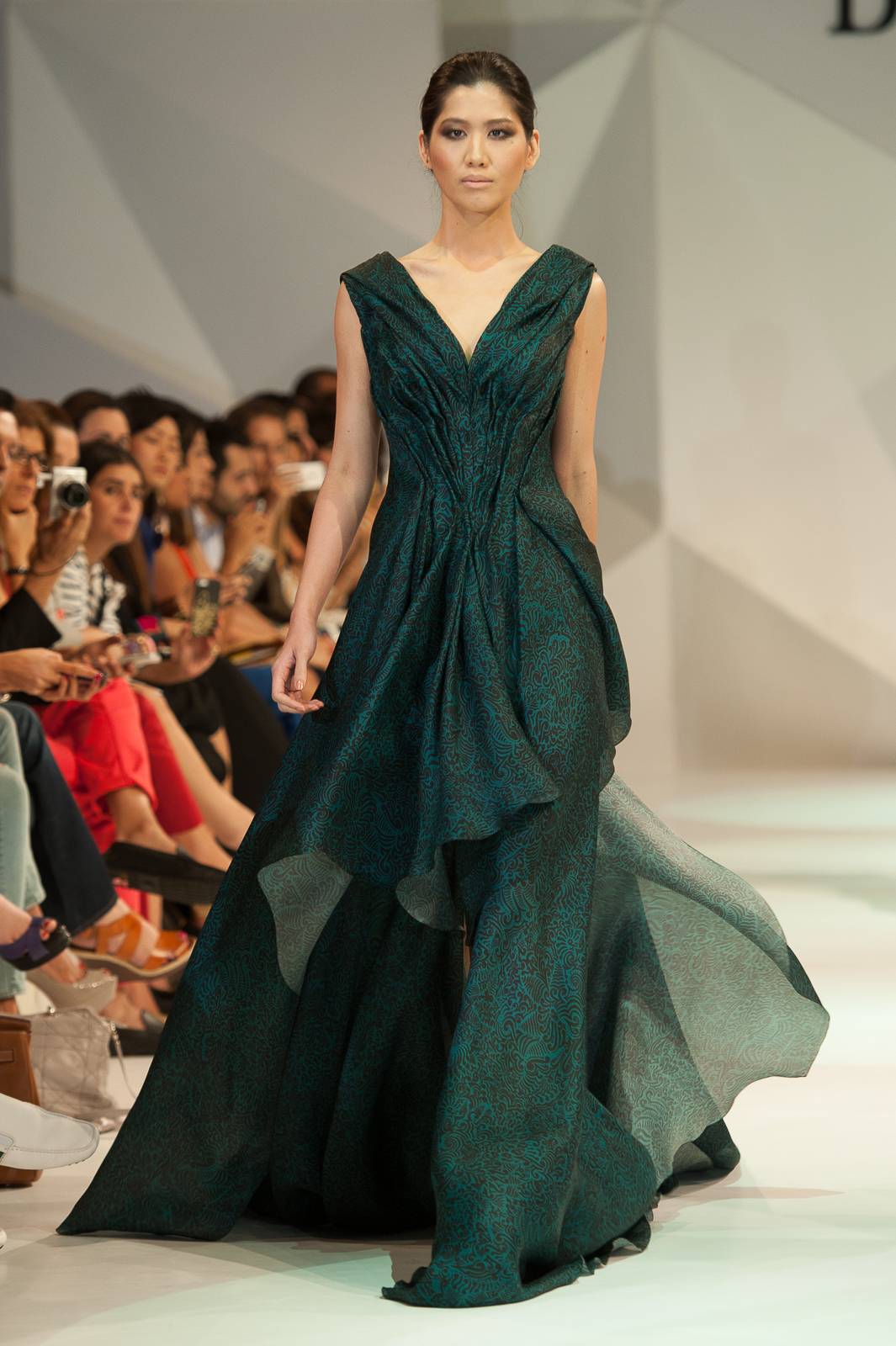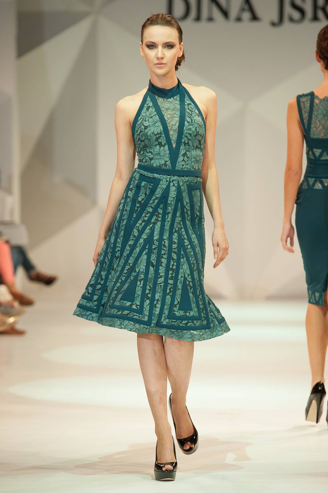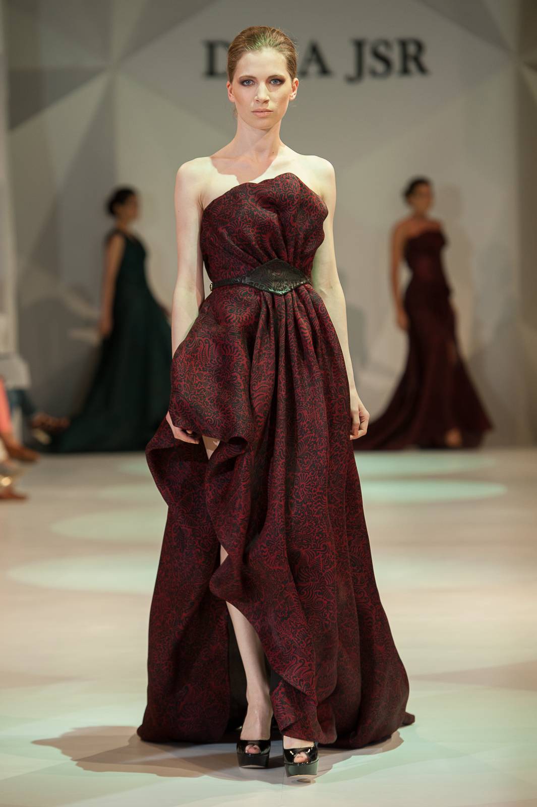 Beirut-based designer Dina JSR debuted her creations of architecturally-inspired garments at Dubai’s Fashion Forward. Showcased was Architectural Figures, her Autumn/Winter 13/14 looks and fourth collection which displayed Jsr’s consistent inspiration: architectural forms. For these designs laden with clear-cut lines and geometric shapes, Jsr looked to the forms of the Dorobanti Tower in Bucarest, Romania designed by architect Zaha Hadid.