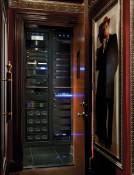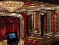 Cantara chose from the “crème de la crème of A/V” systems and added “a generous supply of Genelec speakers.” Thirteen reference-grade speakers and five subwoofers were added to bring 8,400 watts of audio to the room and they were recessed into prime locations around the room and covered by red fabric, which had small portholes cut into it covered by decorative grilles.