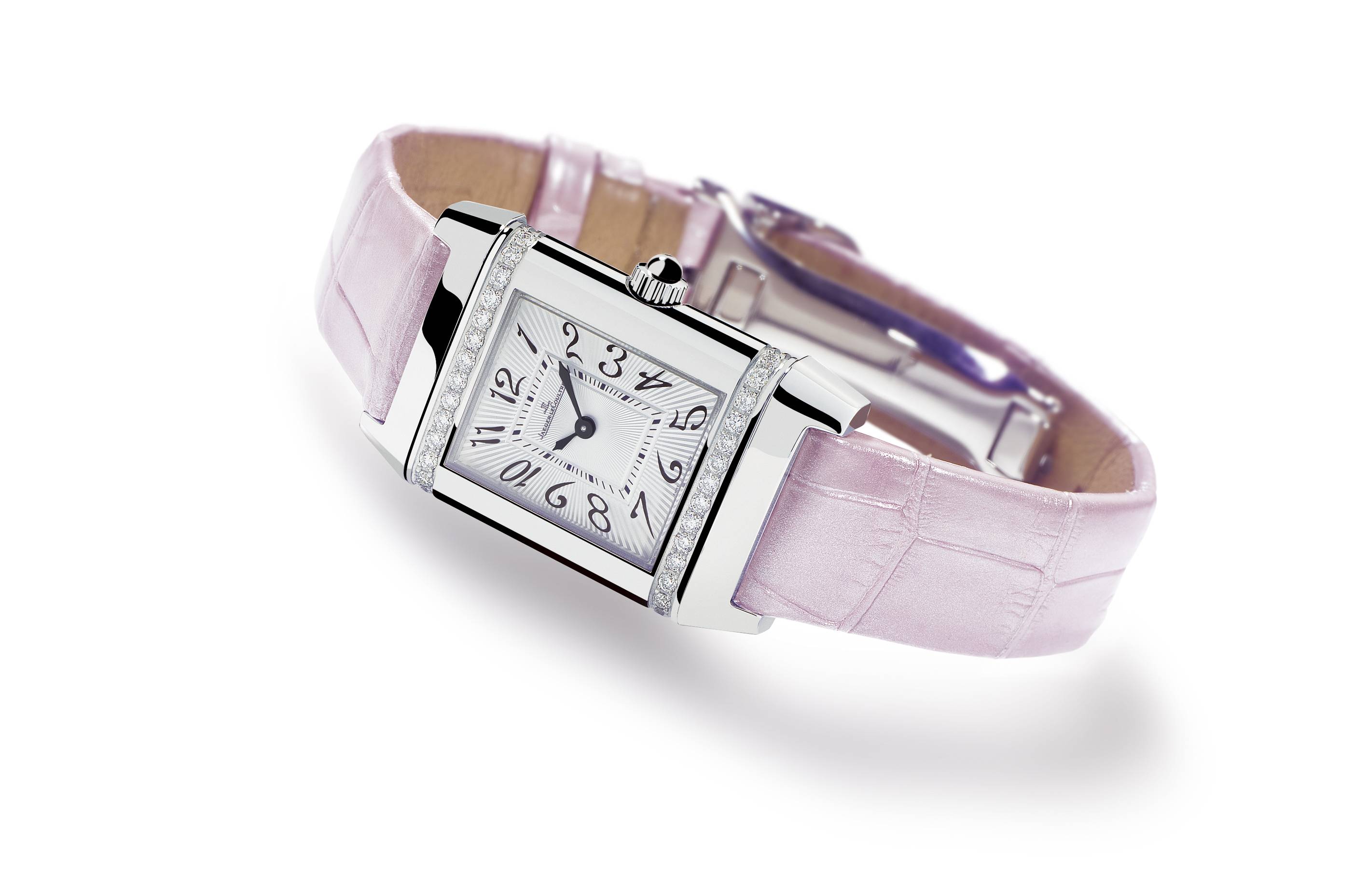 Jaeger-LeCoultre Reverso Lady Jewellery in steel and diamonds with a pink alligator strap