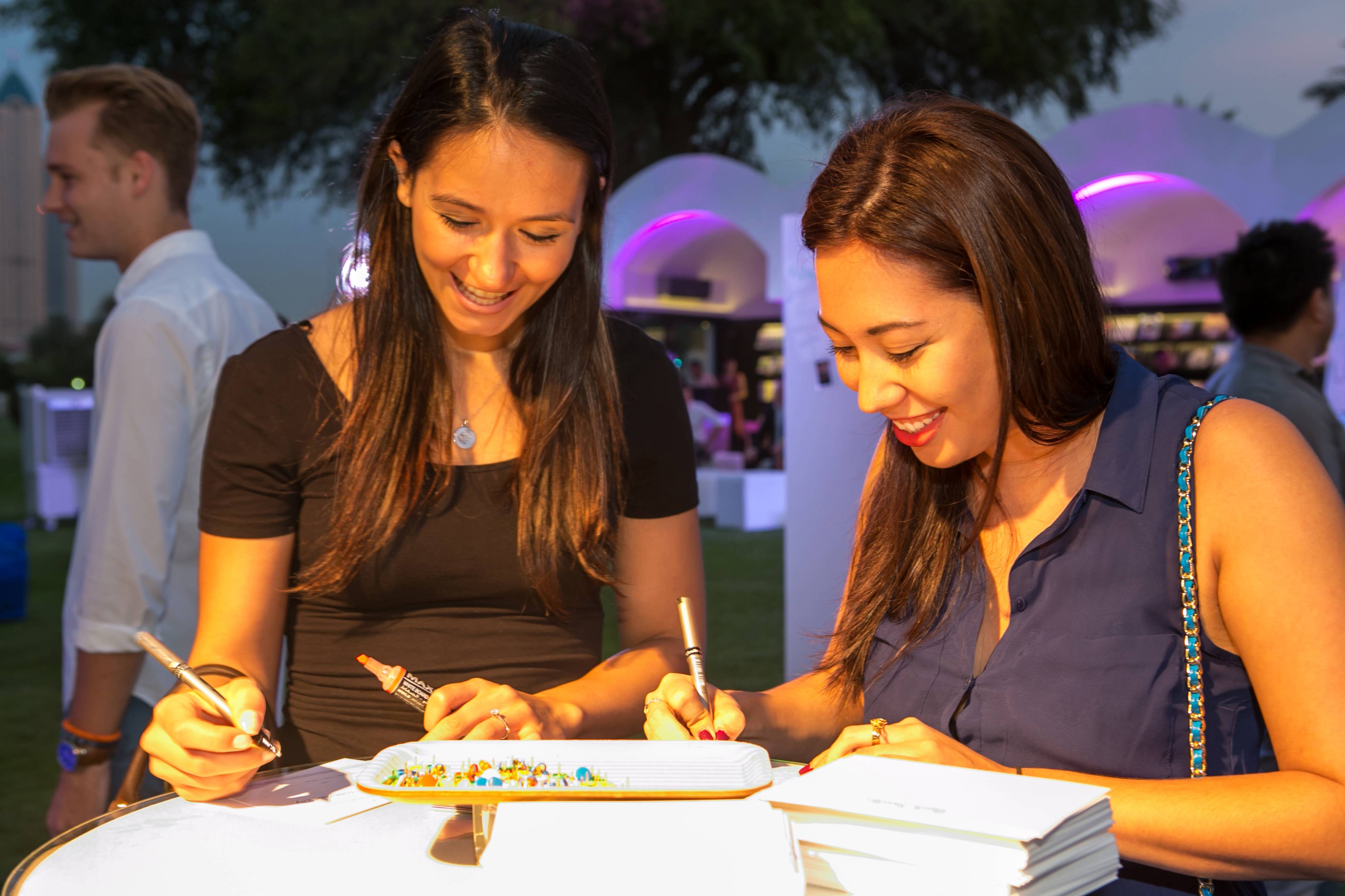 Paul Smith invited three artists to immerse themselves within the brand’s creative universe in order to create the on-site art pieces staged at the event. These included Yasmin Richie, an artist from London who exhibited her STORYLINES UNCUT installation; Dubai-based artist UBIK who conducted an intense session of live sketching on a large blank canvas and Mariam Yakan, who drew caricatures of guests at the event. Each creation corresponded with the concept of the Paul Smith brand. “All the designs in the Storyline collection are inspired by films,” said Richie. “I wanted to show the color palette of a film without any imagery and the stripes were the perfect way to do it – they are abstract and colorful yet understated, very much like the Paul Smith stripes. What I love about the Paul Smith brand is that it’s very classic and elegant, but has an eclectic edge to it that makes the brand fun and playful while still being quintessentially British.”