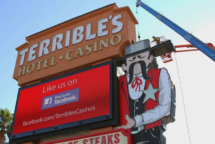 Terrible’s Hotel & Casino began uninstalling its iconic Terrible’s Cowboy neon sign in preparation for the property’s transition to a new name with the launch of Silver Sevens Hotel & Casino in July 2013.