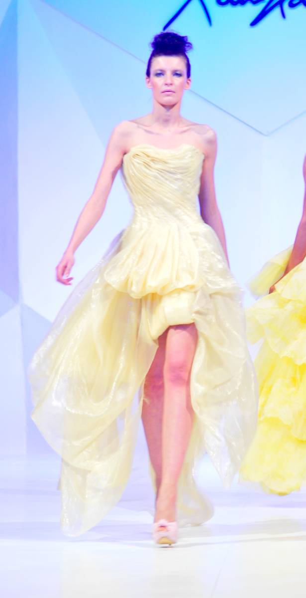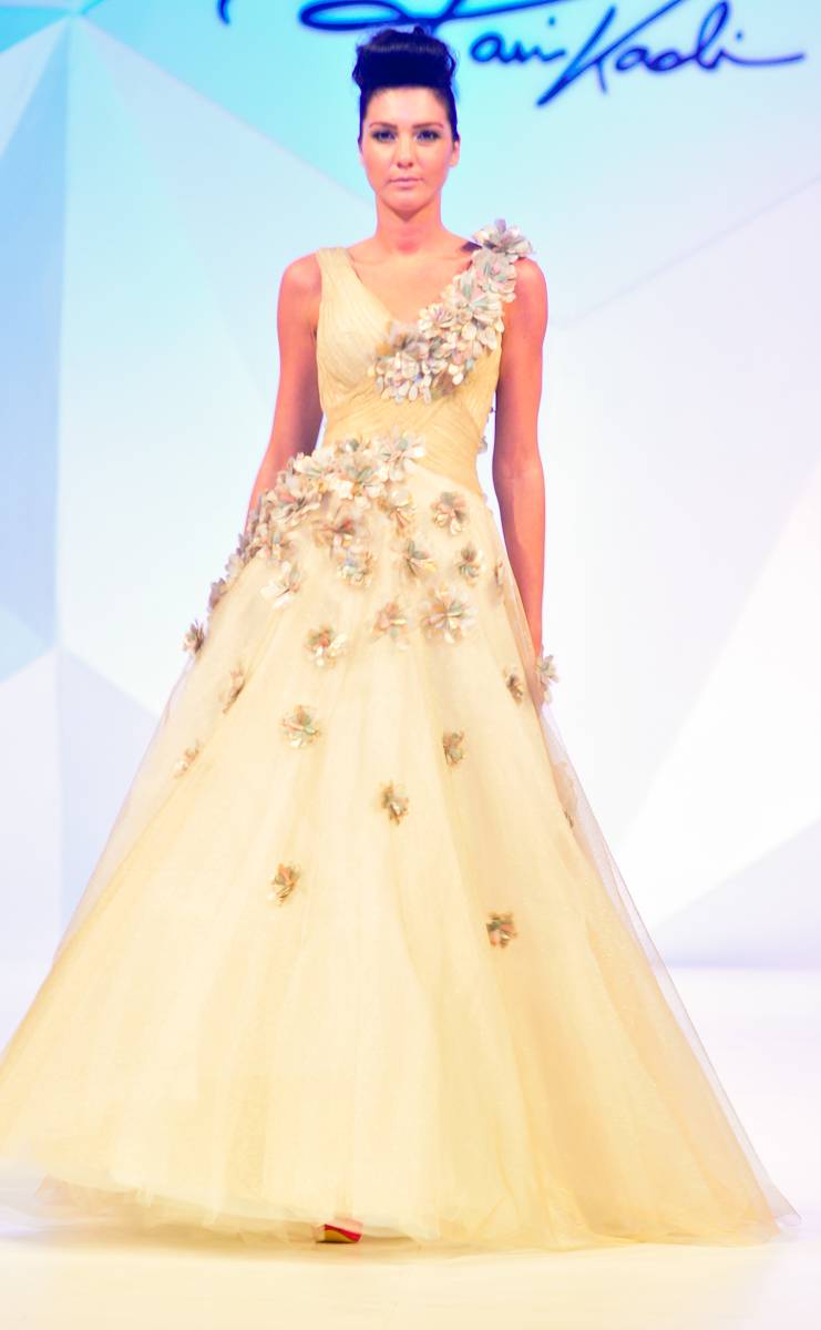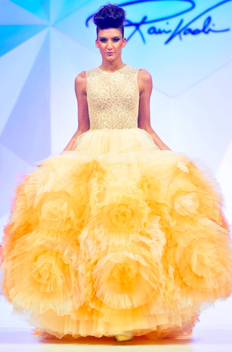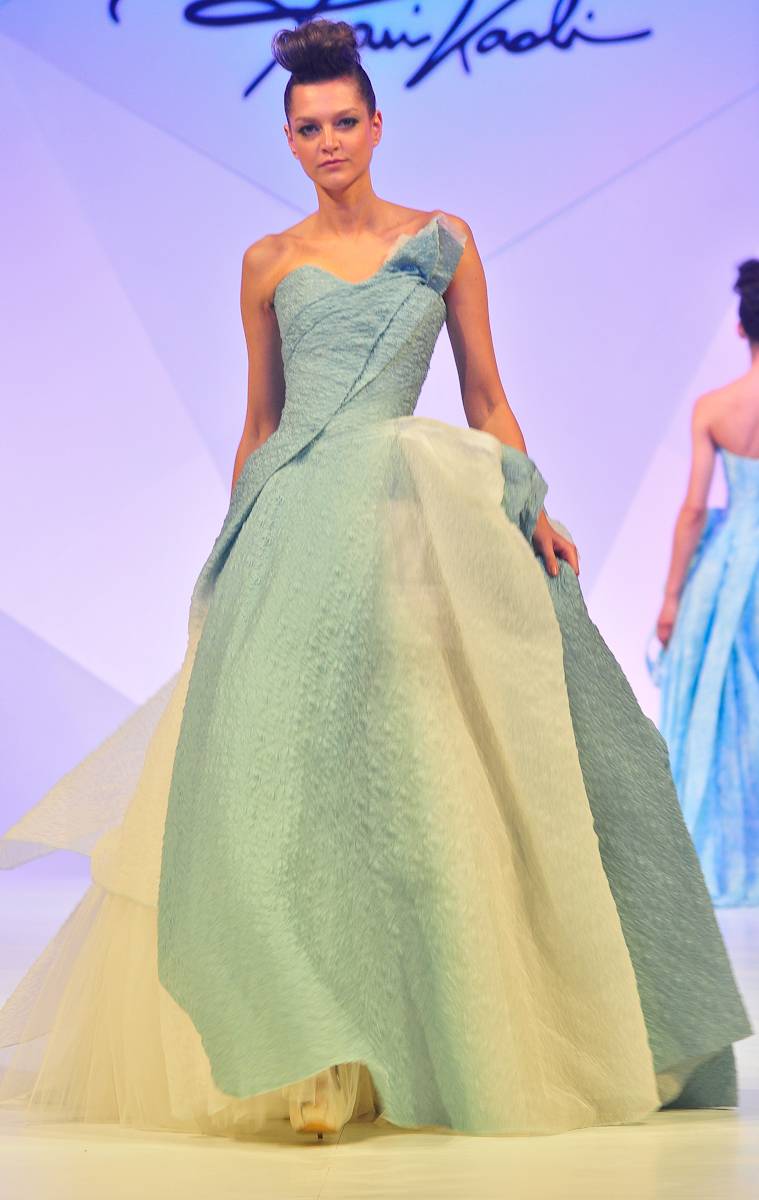 Les Jardins Suspendus, which means “the hanging gardens” in French, is Rami Kadi’s latest collection. Filled with lace embroidered flowers on lengthy pastel colored gowns made of tulle and other refined fabrics, Kadi’s latest creations resulted in dreamy figures akin to those found in a fairy tale book. The show was Kadi’s first in Dubai and featured Lebanese singer Myriam Fares who walked down the stage as the guest of honor.