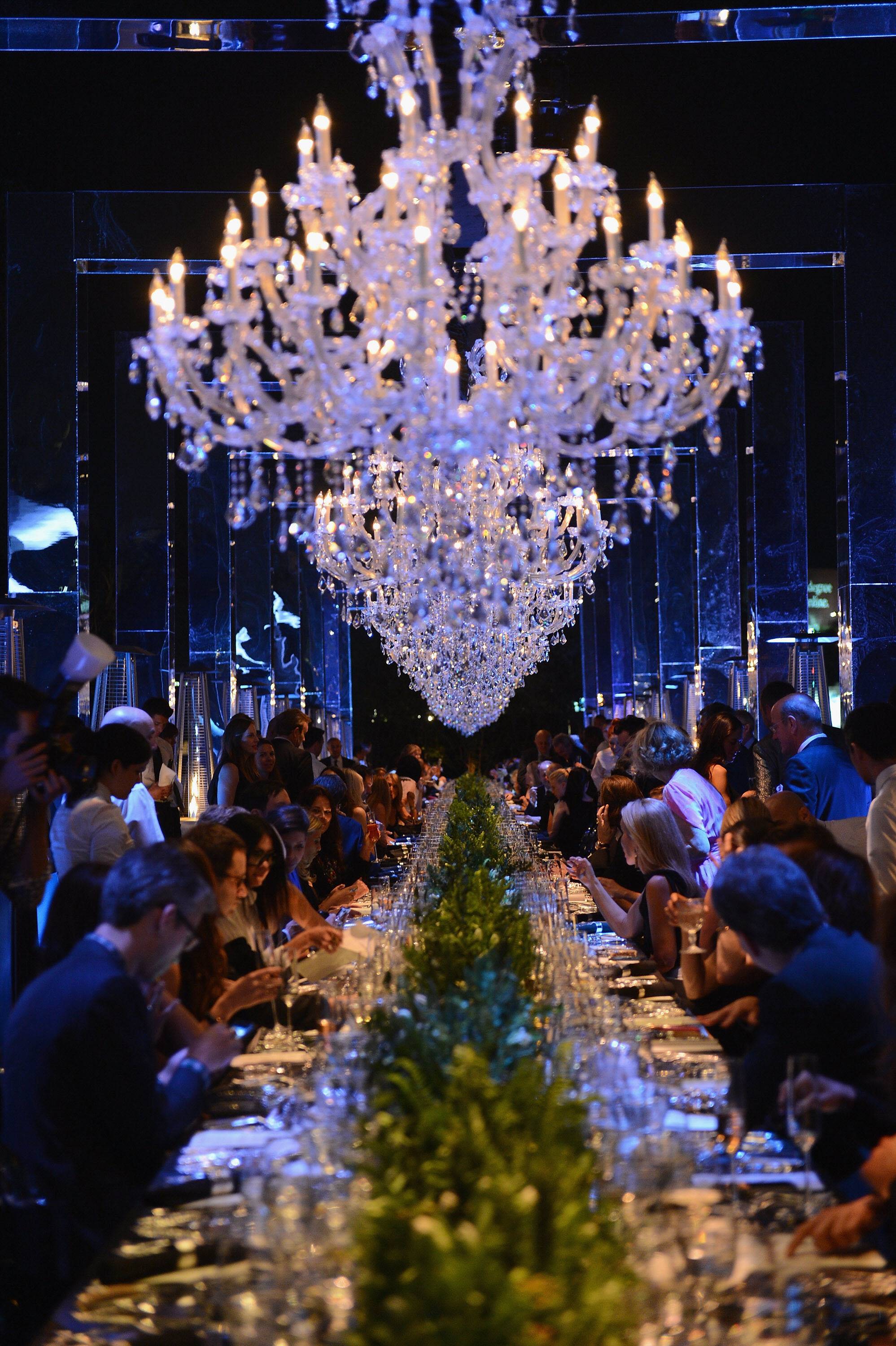 Guests including Rochelle Gores Fresston, Liz Goldwyn, Gregory Parkinson, Scott Sternberg, and Kendall Conrad were then chauffeured to LACMA to dine at a 144-foot long, chandelier-lit table under mirrored arches open to the spring sky and adjacent to Levitated Mass, a monumental outdoor sculpture by artist Michael Heizer.
