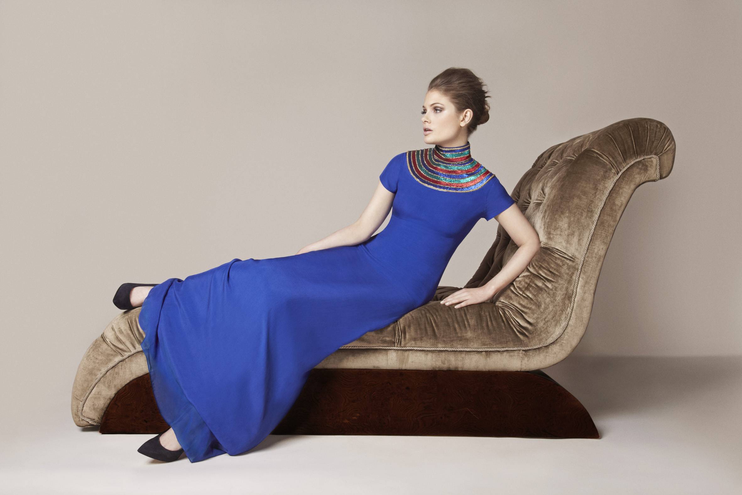 Jamal’s previous and current collections are a true display of beautiful, luxurious evening and swim wear that have been crafted using the finest, purest, silk fabrics in an array of colors. He uses detailed hand embroidery and a variety of semiprecious gem stones to enhance the designs and create individual pieces that have more to them than meets the eye. The current Spring/Summer 2013 collection is no different in terms of the exceptional and luxurious quality it offers, but this time it takes inspiration from ancient Egypt.