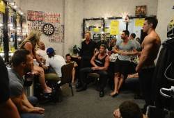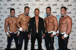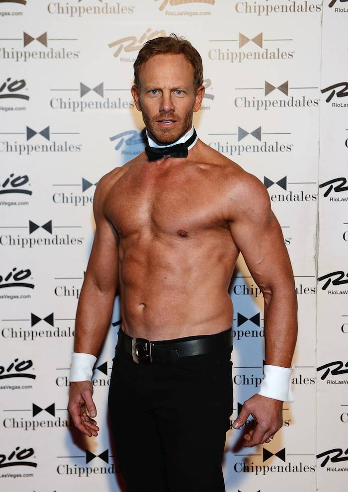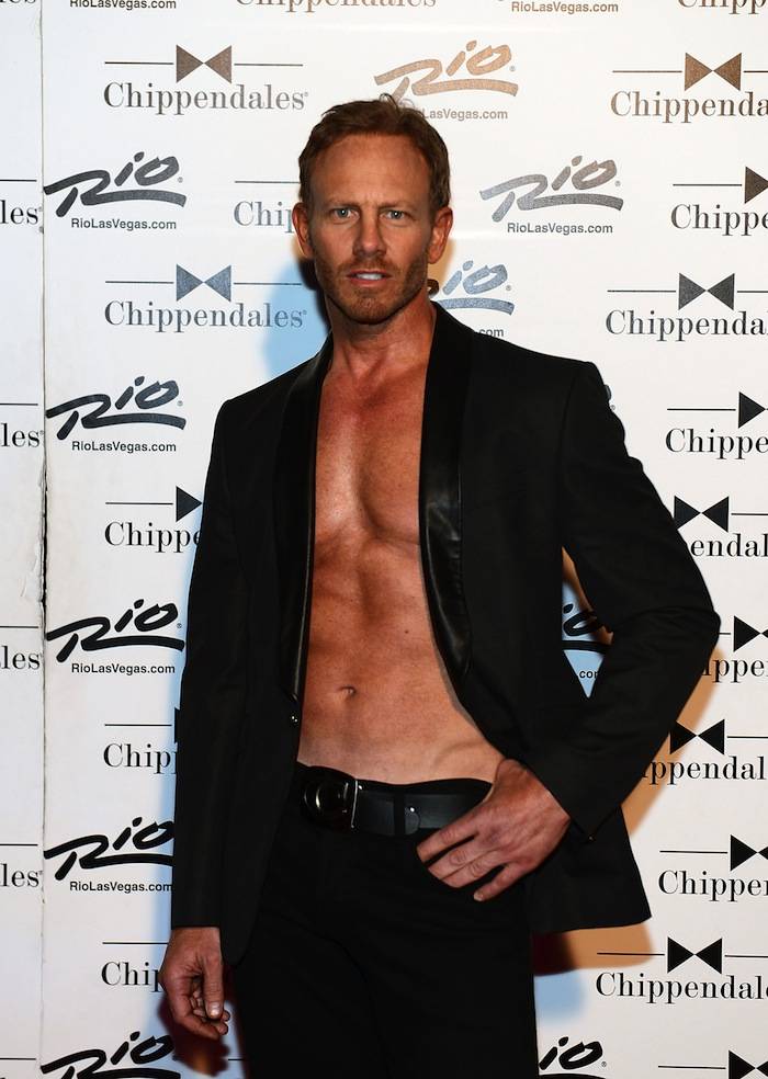 Actor Ian Ziering, known for his role as Steve Sanders from “Beverly Hills, 90210” now dons the cuffs and collars in the cast of Chippendales at the Rio. The 49-year-old rips off a signature Chippendales tank top to show off his abs in his role as emcee.