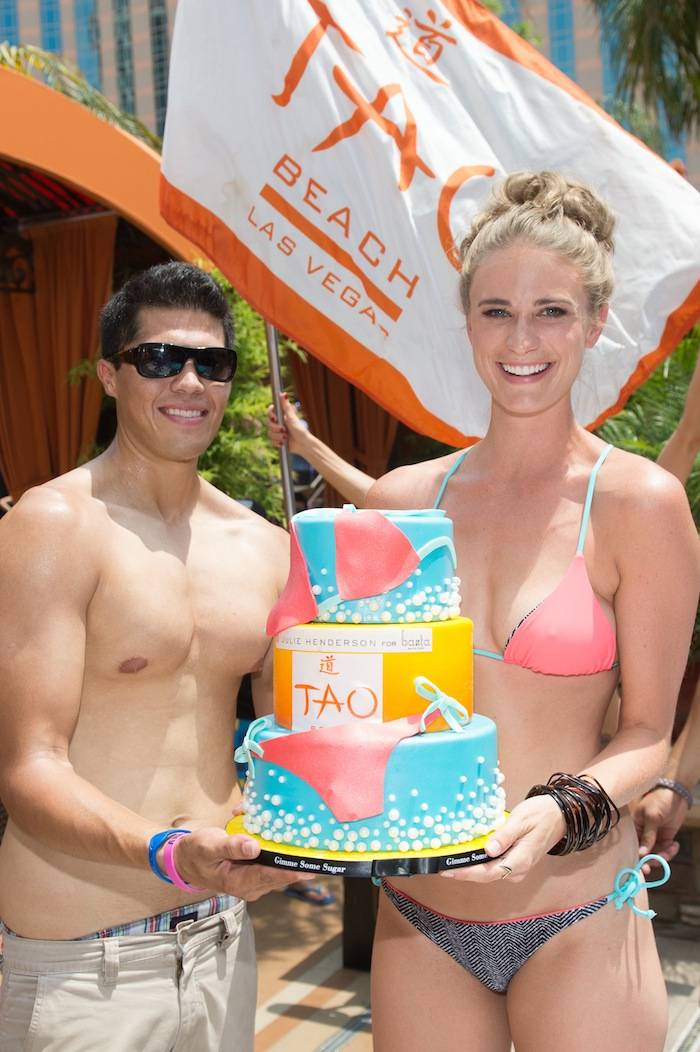 Saturday afternoon at Tao Beach at the Venetian, model Julie Henderson, best known for her appearances in Sports Illustrated Swimsuit Issue, celebrated her new swimsuit line Basta Surf for Julie Henderson. Rocking a baby blue and coral reversible suit from her collection, Henderson enjoyed the pool scene with girlfriends at a VIP cabana and even jumped in the DJ booth for a bit. The group sipped on cocktails and munched on small bites before Henderson was presented with a congratulatory cake.