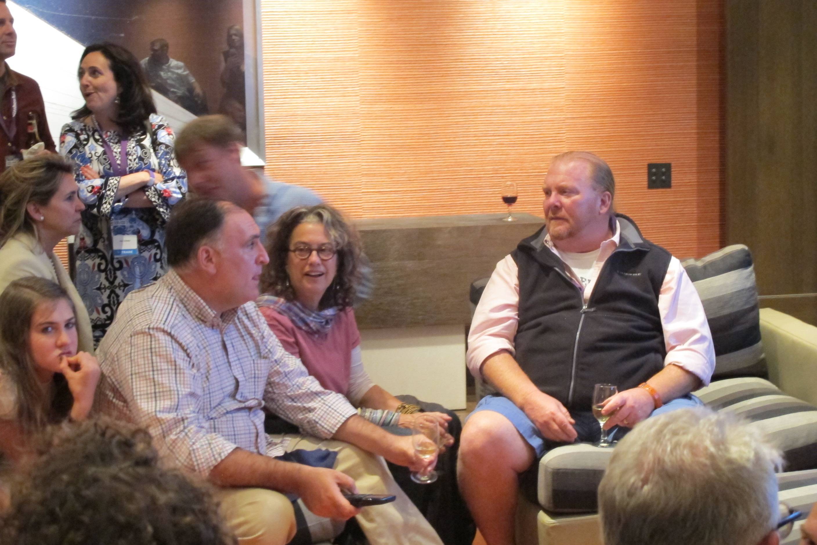Jose Andres and Mario Batali talk basketball during the NBA finals at the Wines of Spain house on West Buttermilk.