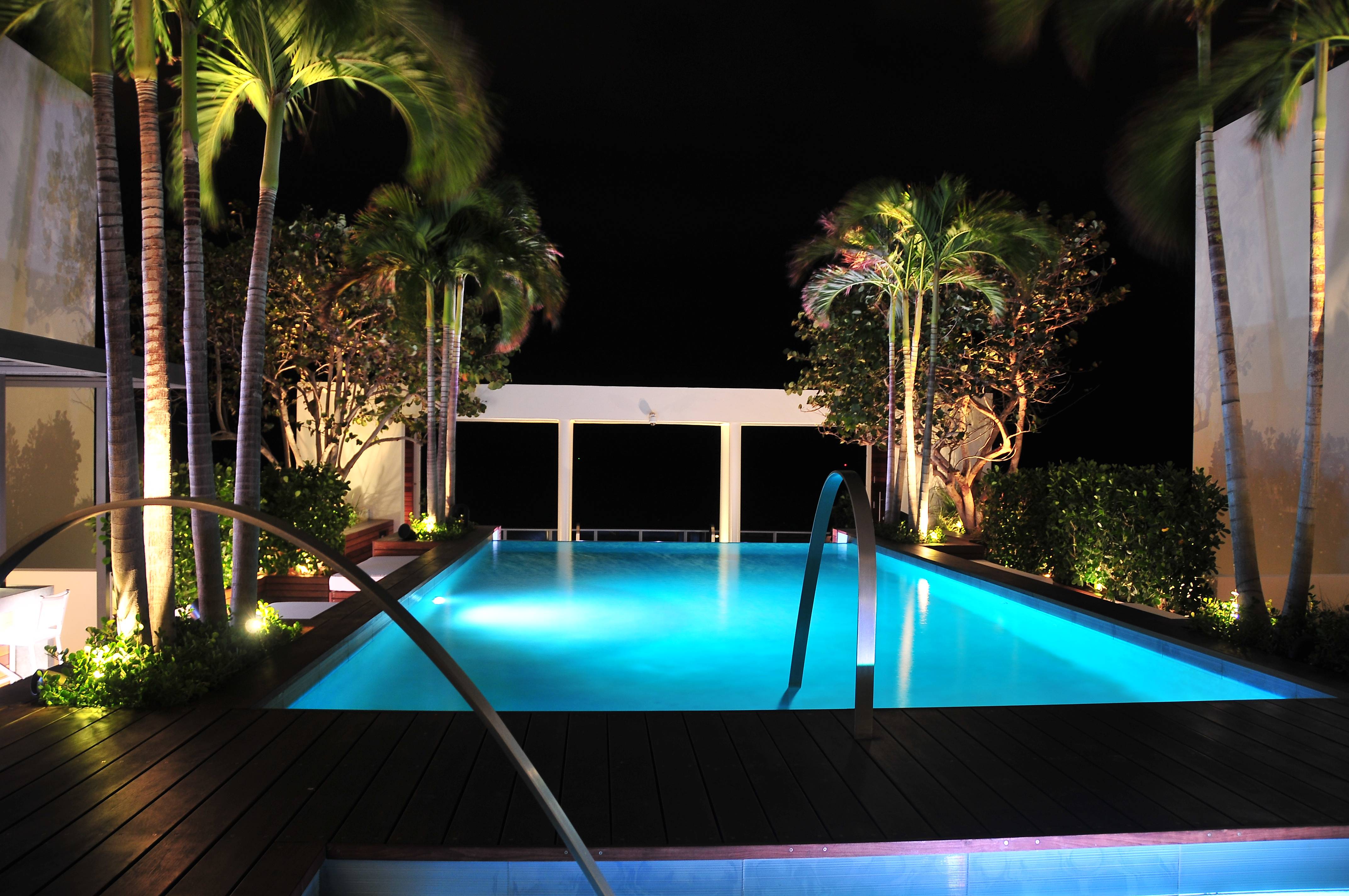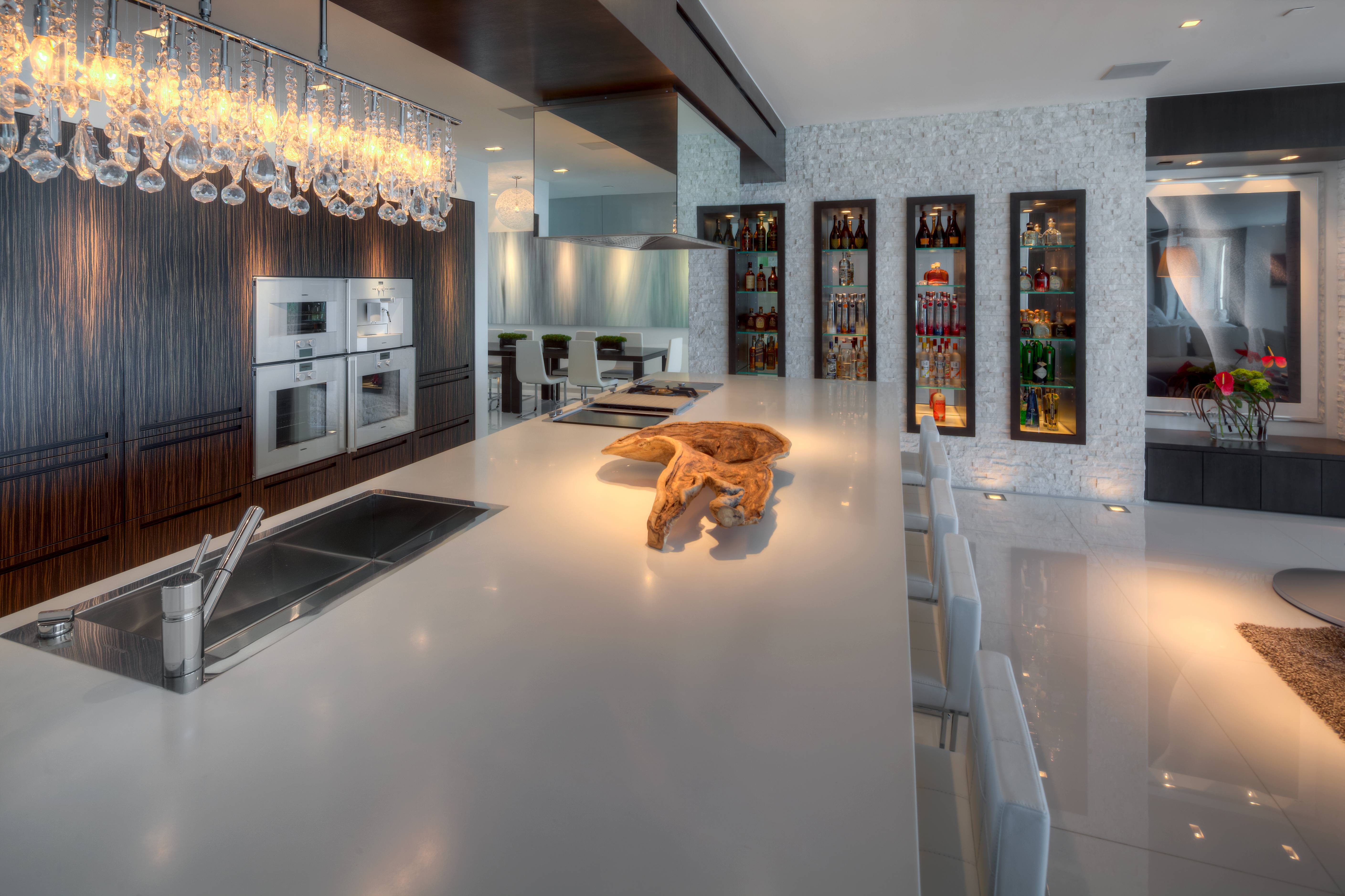 The 4,176 Sq feet of interior living space was done by renowned designer Alison Atrobus, whose work includes Prime 112, Prime Hotel and Pat Riley’s condo. It features a private entry foyer, zebra wood BOFFI kitchen and Gaggenau appliances, white glass slab floors, Corian wrapped walls, a LED lit spiral staircase leading to the rooftop and a fully automated Crestron system. The luxurious penthouse also includes 5,161 Sq feet exterior entertaining spaces finished in Ipe Wood.