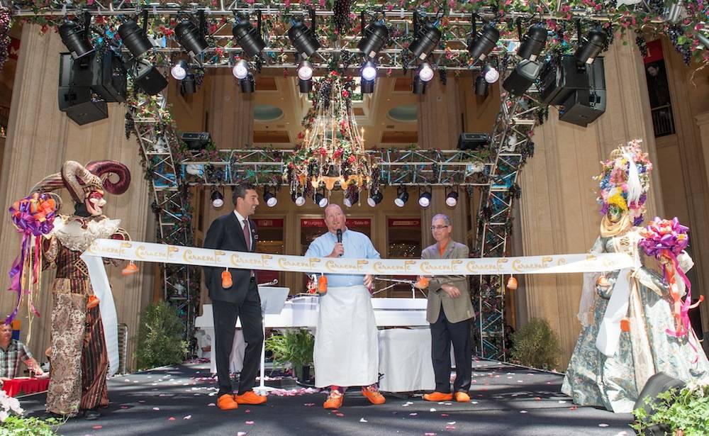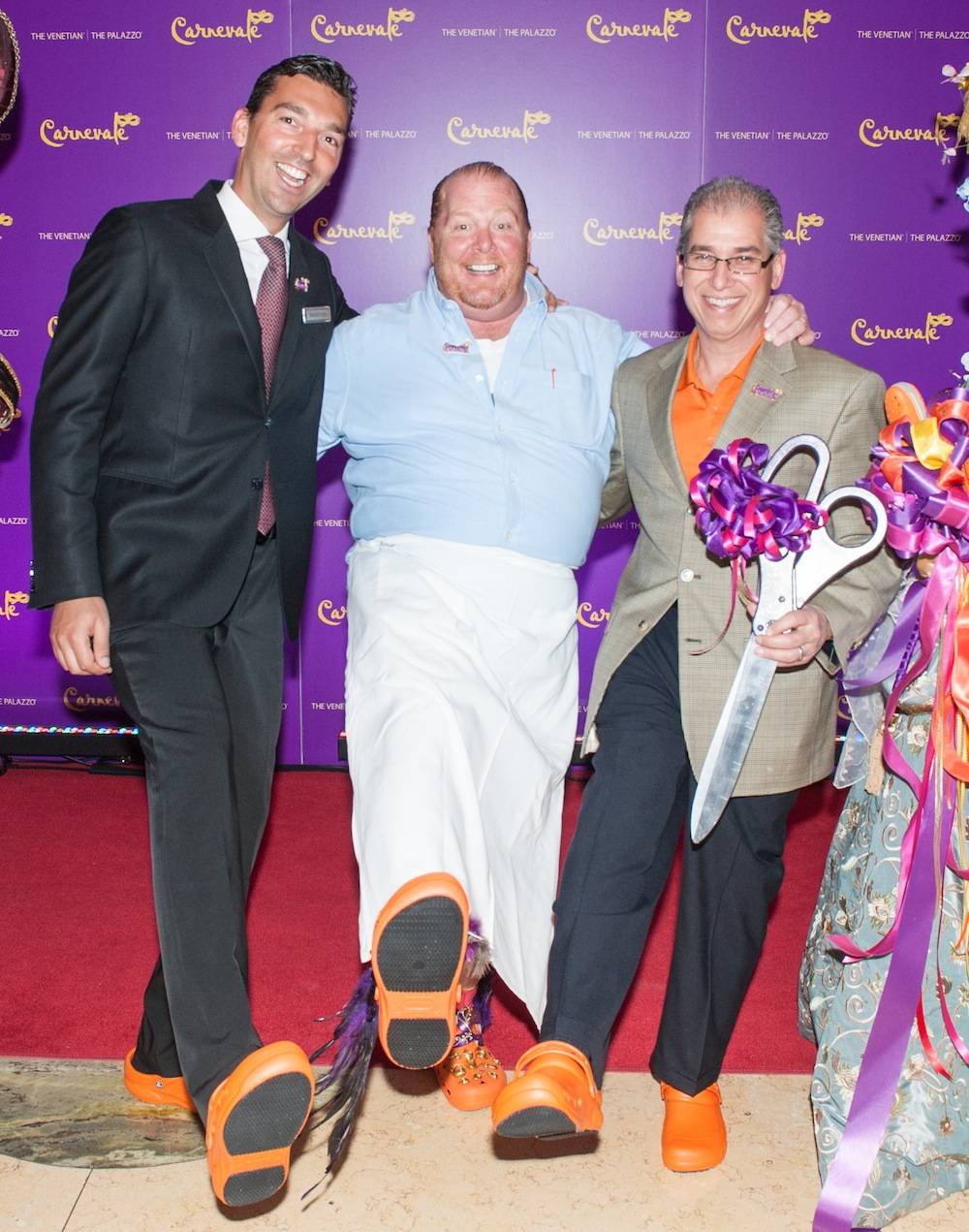 The Venetian and Palazzo officially opened Carnevale — the summer-long event celebrating the festivals of Italy — on Saturday. Chef Mario Batali arrived on the red carpet to kick off Carnevale wearing a special Carnevale-inspired pair of his signature orange Crocs. Batali cut the purple ribbon signifying the start of Carnevale with John Caparella, president and chief operating officer of the Venetian, Palazzo and Sands Expo, and Sebastien Silvestri, vice president of food and beverage.