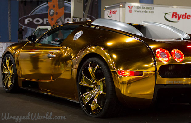 The eponymous villain in Austin Power’s Goldmember may love gold, but not as much as Miami rapper Flo Rida. The “Whistle” rapper decided to wrap his brand-new Bugatti Veyron in shiny gold. Even the supercar’s rims are tricked out with 24-karat gold Forgiato rims. The Hollywood-based company, Metro Wrapz, who has been in business for two decades, did the project. Miami is the place where flash is king, but Flo’s gold 1000 horsepower sports car definitely takes the cake.