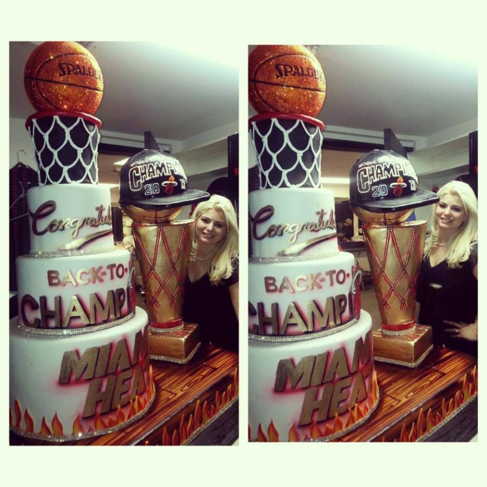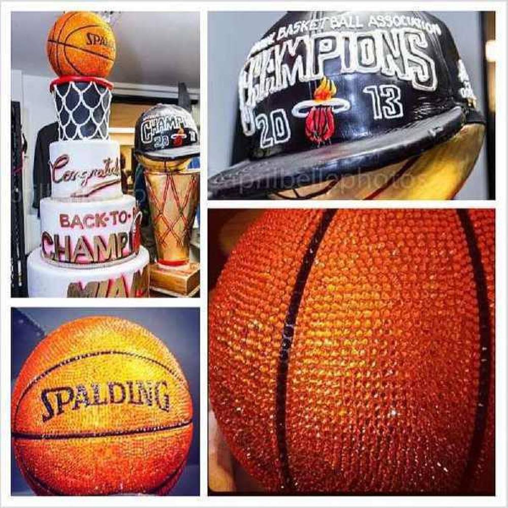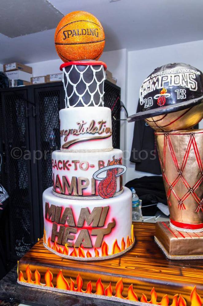 Friday night the Miami Heat’s big three, LeBron James, Dwyane Wade and Chris Bosh, continued the celebration at Bamboo where they were presented with an amazing cake from Divine Delicacies. The bakers, confident in the team’s abilities, started on the crystal covered part of the cake two weeks ago. The elaborate red velvet, cream cheese and vanilla rum cake confection consisted of many tiers and towers. The Larry O’Brian “trophy” was painted in 24 karat edible gold, one of the famous championship hats was replicated out of sugar, and well, a basketball-shaped cake bedazzled with Swarovski crystals topped it all off. No word yet on how they managed to avoid eating the famous European crystals.