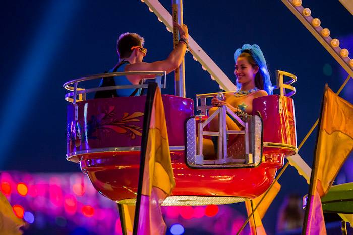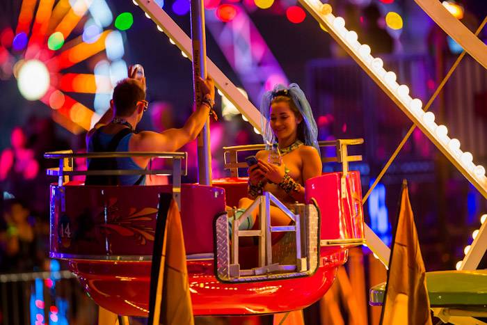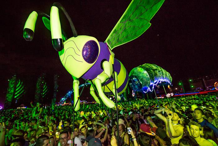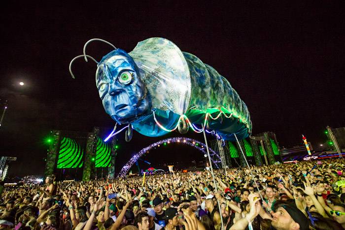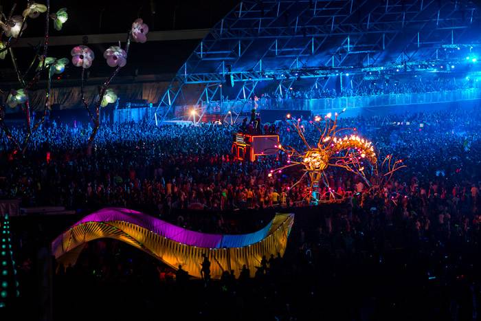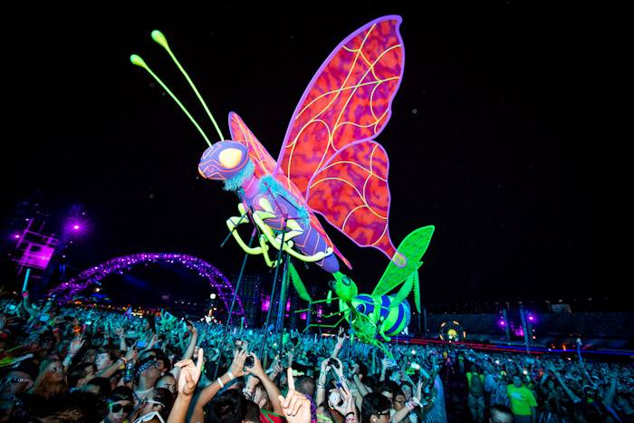 Interactive art installations offered a highlight throughout the festival including “The Electric Daisy” by artist Poetic Kinetics, a 100-foot articulated moving flower rising above the attendees to dance, play and engage. New to this year’s festival, the Flaming Lotus Girls’ introduced Soma, a 25-foot high and 50-foot long interactive sculpture. The piece includes fire effects that are controlled by fans from a distance, allowing them to communicate with the installation itself.