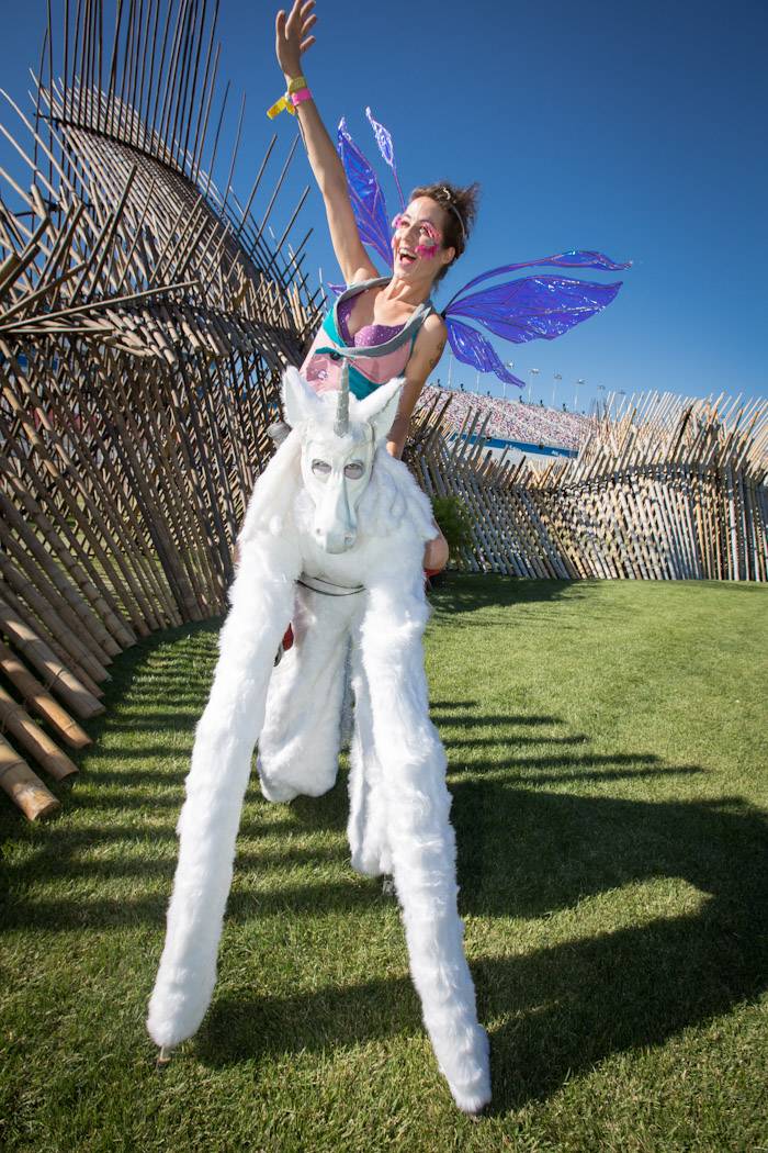 At 11:30 p.m. the theatrical performers took over the complex with a parade interweaving through the show. Starting from the Circuit Grounds stage, more than 50 of the festival’s clowns, Lollipop girls and more marched alongside the art cars. Several rode through on the Pushing Daisies art car, a float-style bouquet with female performers in character as flowers.