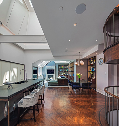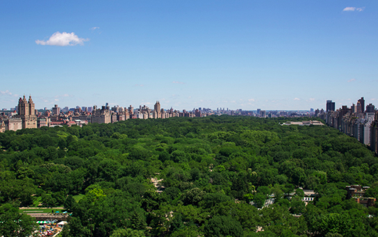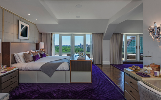 Located at 1 Central Park South, the four bedroom, five-and-a-half bathroom penthouse features a private elevator, gourmet kitchen, 14-seat dining room, plus breathtaking views of New York City. In addition to 229 square feet of exterior space, the unit boasts an angled glass wall that offers unobstructed views of Central Park.